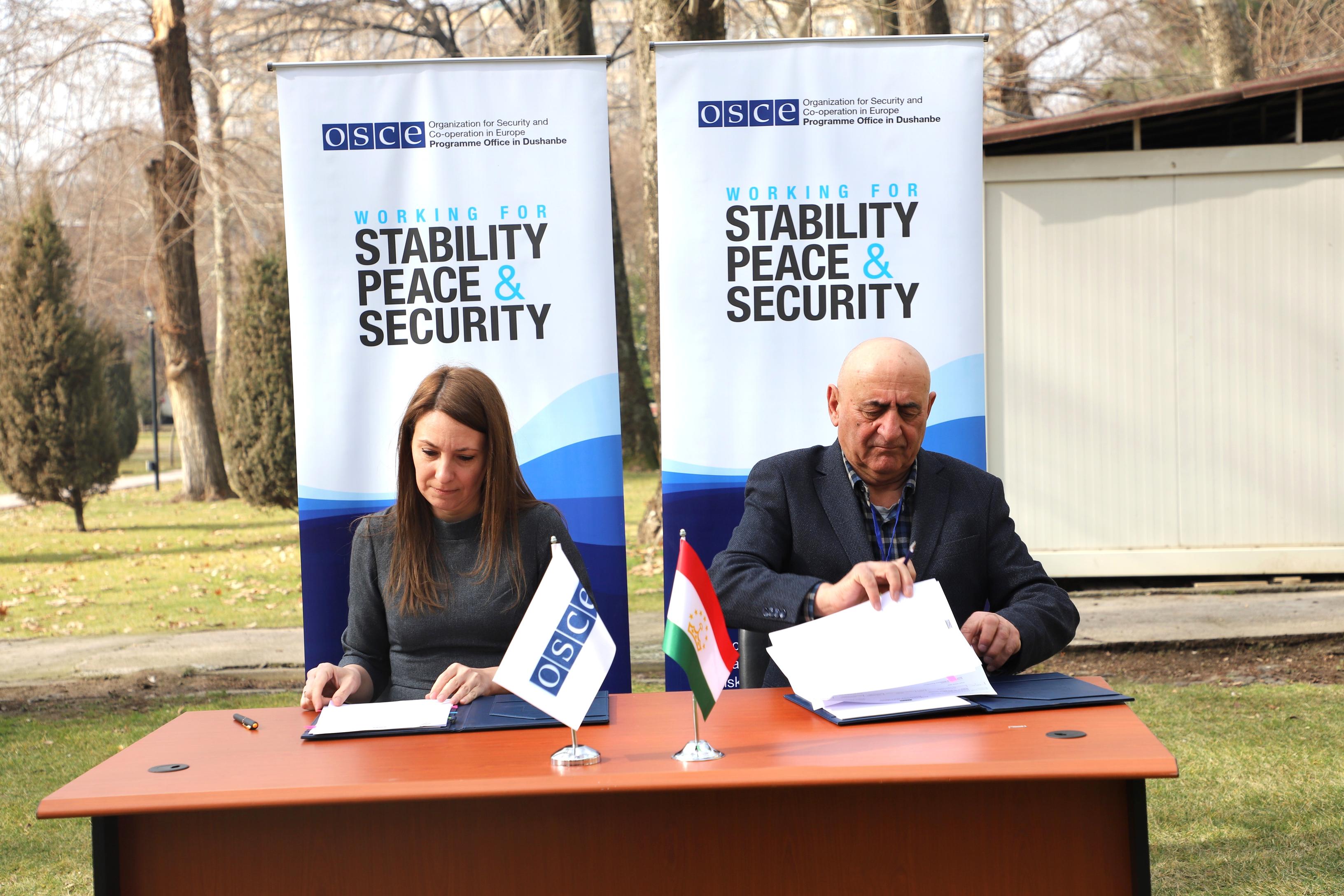 Tatiana Turcan, Acting Head of the OSCE Programme Office in Dushanbe, and Himmatsho Ghairatov, Director of the Women’s Resource Centre (WRC) “Khingob,” at the OSCE vehicle donation ceremony to WRC “Khingob” in Tavildara, Dushanbe, 2 February 2026.