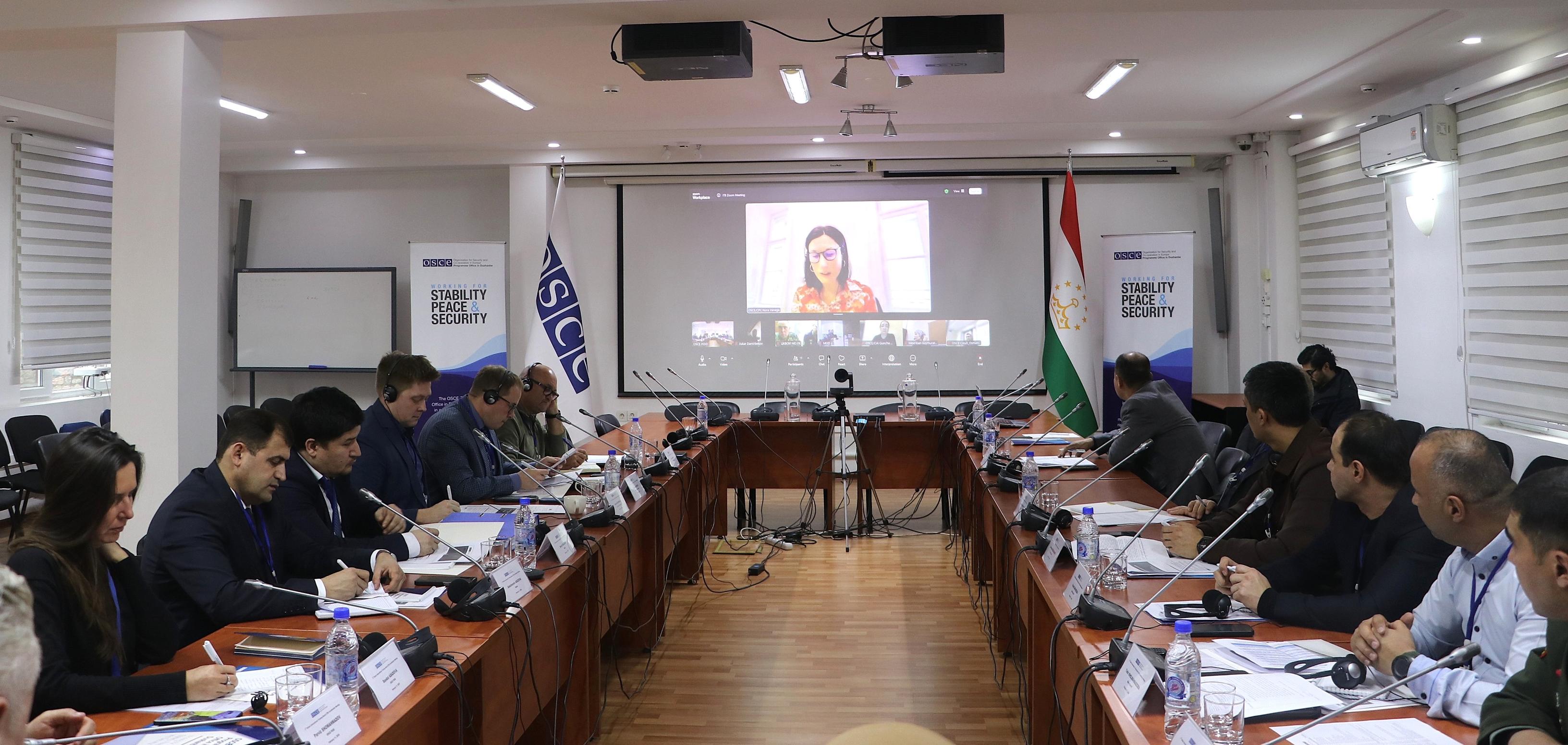 Participants from the OSCE Secretariat and field operations, Ministries of Defence and Border Troops from across Central Asia, the United States Embassy, US Army Central (USARCENT), and Fondation Suisse de Déminage (FSD) attend the Third International Training Board Meeting, held in a hybrid format in Dushanbe, 11 February 2026.
