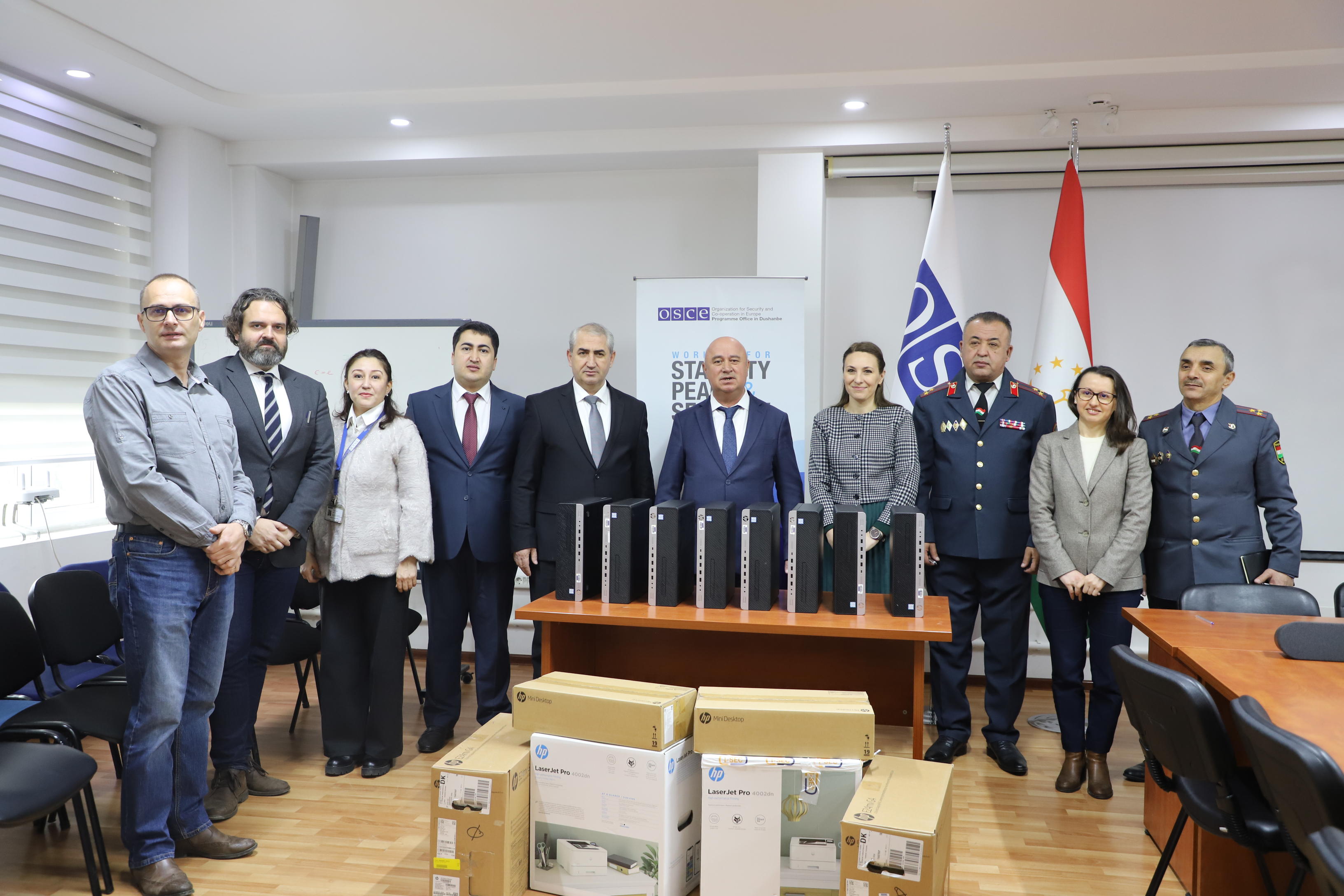 Representatives from the OSCE Programme Office in Dushanbe and Ministry of Internal Affairs of the Republic of Tajikistan gather to mark the donation of IT equipment to the Gender Sensitive Police Units, strengthening efforts to prevent and respond to domestic violence, Dushanbe, 12 March 2026.