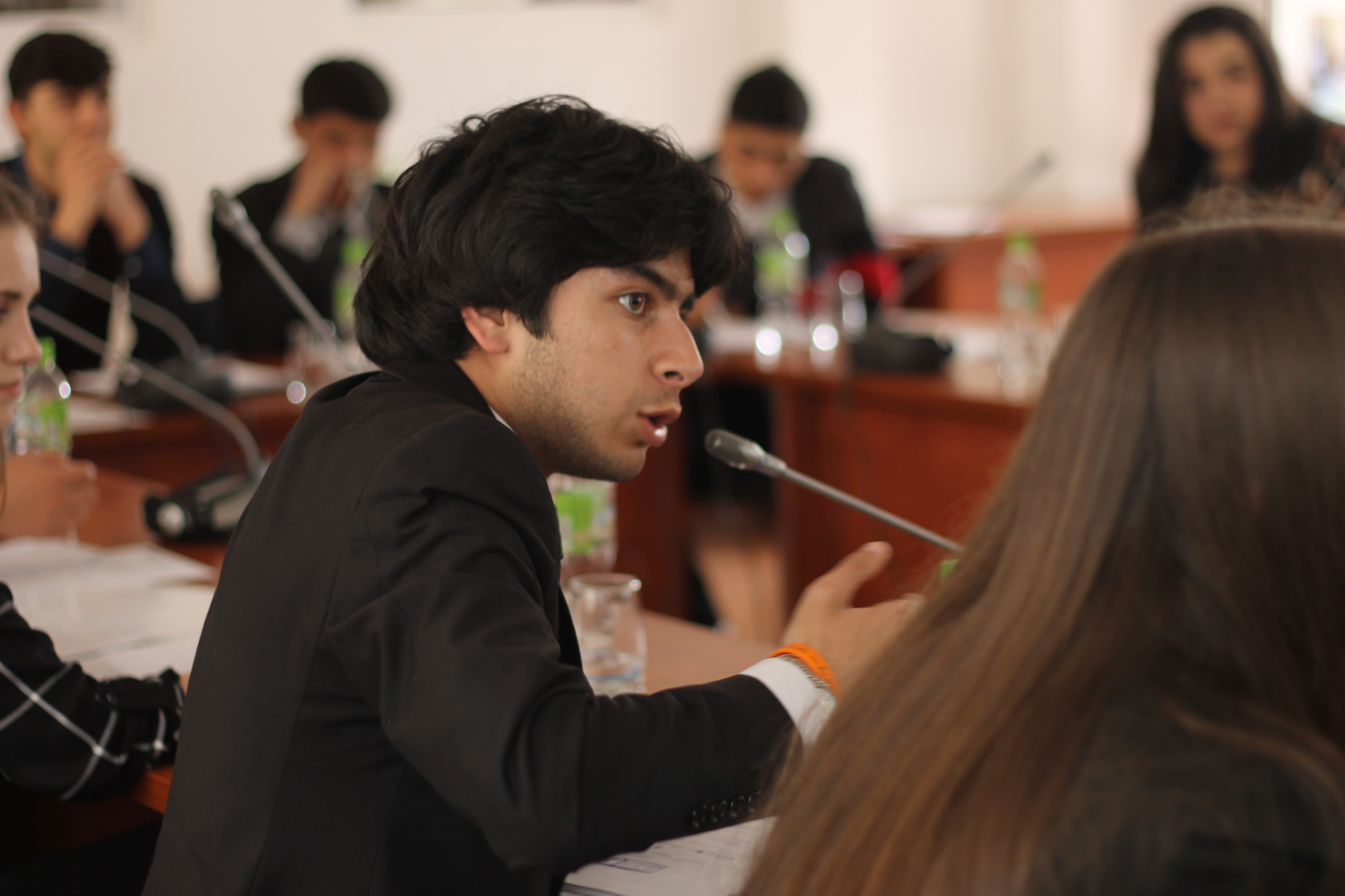 Mehroj Sherov, a student from the Tajik branch of Moscow State University, asking a question, Dushanbe, 22 March 2017.