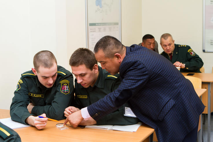Ravshanbek Kamchybekov from Kyrgyzstan, a graduate of an OSCE train-the-trainer course, delivers a training session to the cadets of the Latvian State Border Guard College, Rezekne, 19 April 2017.
