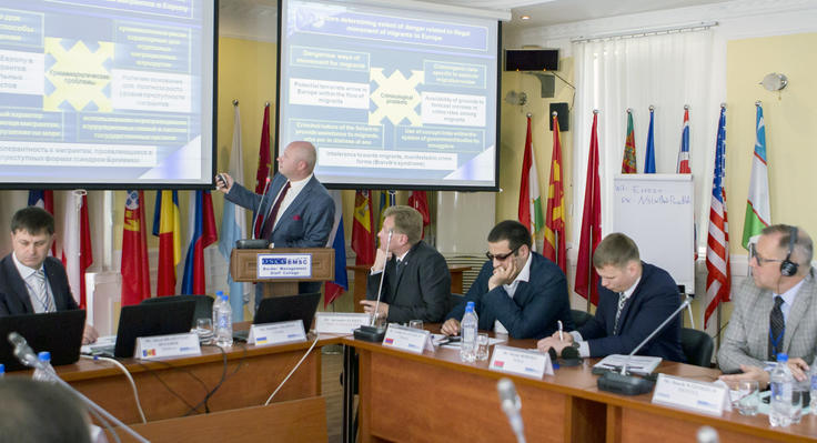 Stanislav Philippov, Associate Professor of Criminal Law and Procedure Department of the National Academy of the State Border Service of Ukraine, presents research findings on criminological issues of cross-border migration at the OSCE Border Management Staff College in Dushanbe, 1 May 2017.