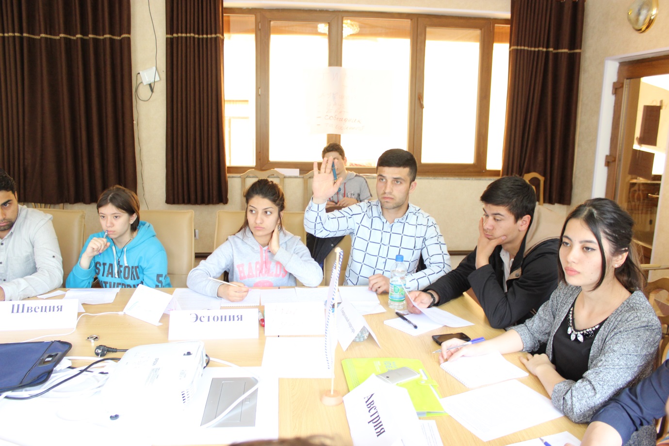 Participants representing various countries during a negotiation exercise, discuss how to reach consensus while having different interests and positions on the same issue, Khoja Obigarm, 27 April 2017.