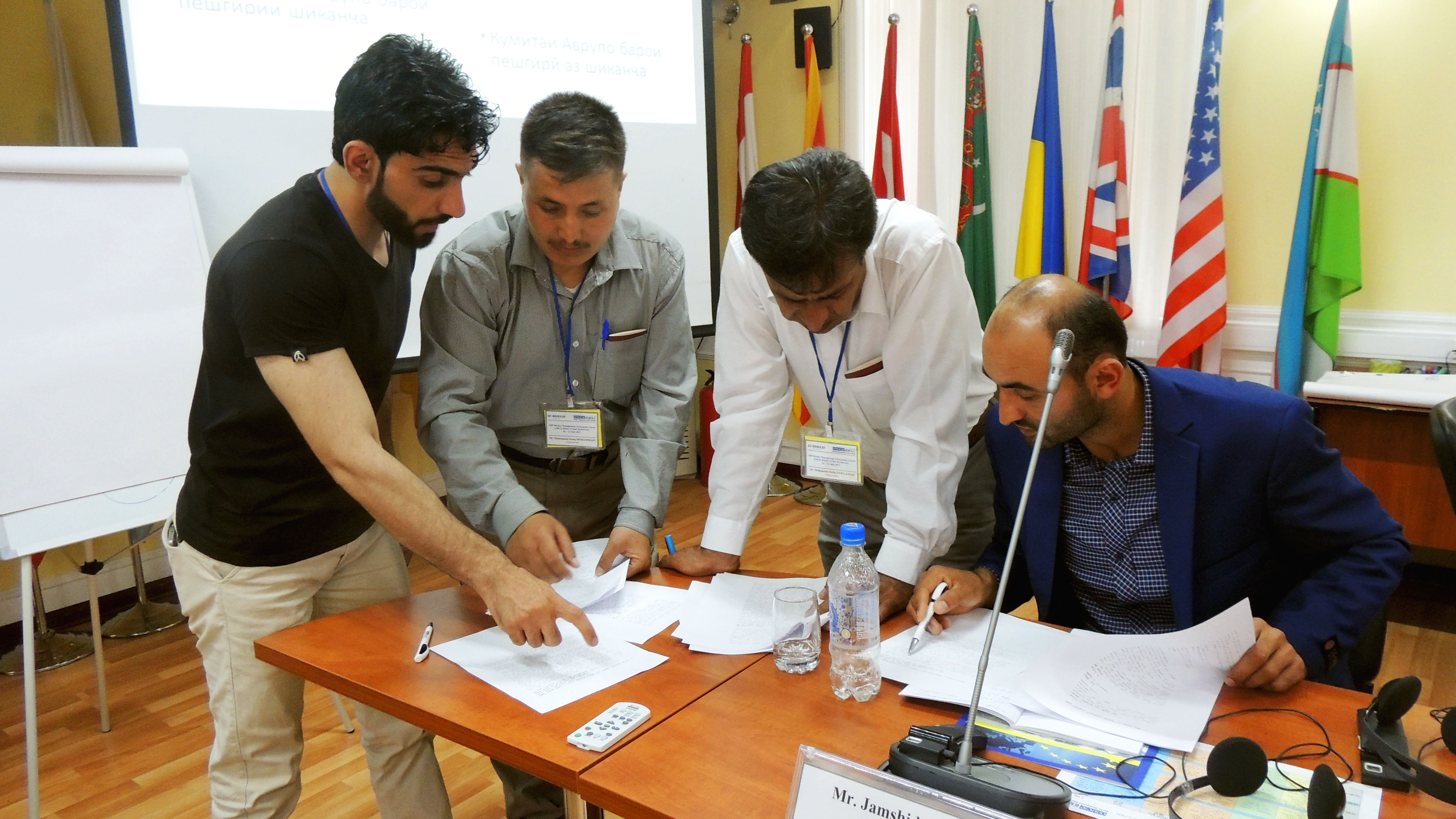 Participants from Afghanistan discuss human rights in border security and management at the OSCE Border Management Staff College in Dushanbe, 5 July 2017.