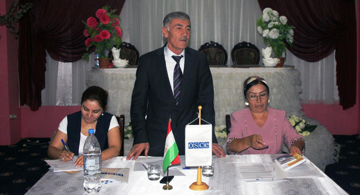 (l-r) Mahbuba Mamadatokhonova, National Gender Officer of the OSCE Programme Office in Dushanbe, Major General Farhodbek Shodmonzoda, the National Co-ordinator for Police Reform and Mavjuda Nazirova, Deputy Head of Women and Family Affairs Department in Isfara city, Isfara, 13 September 2017.