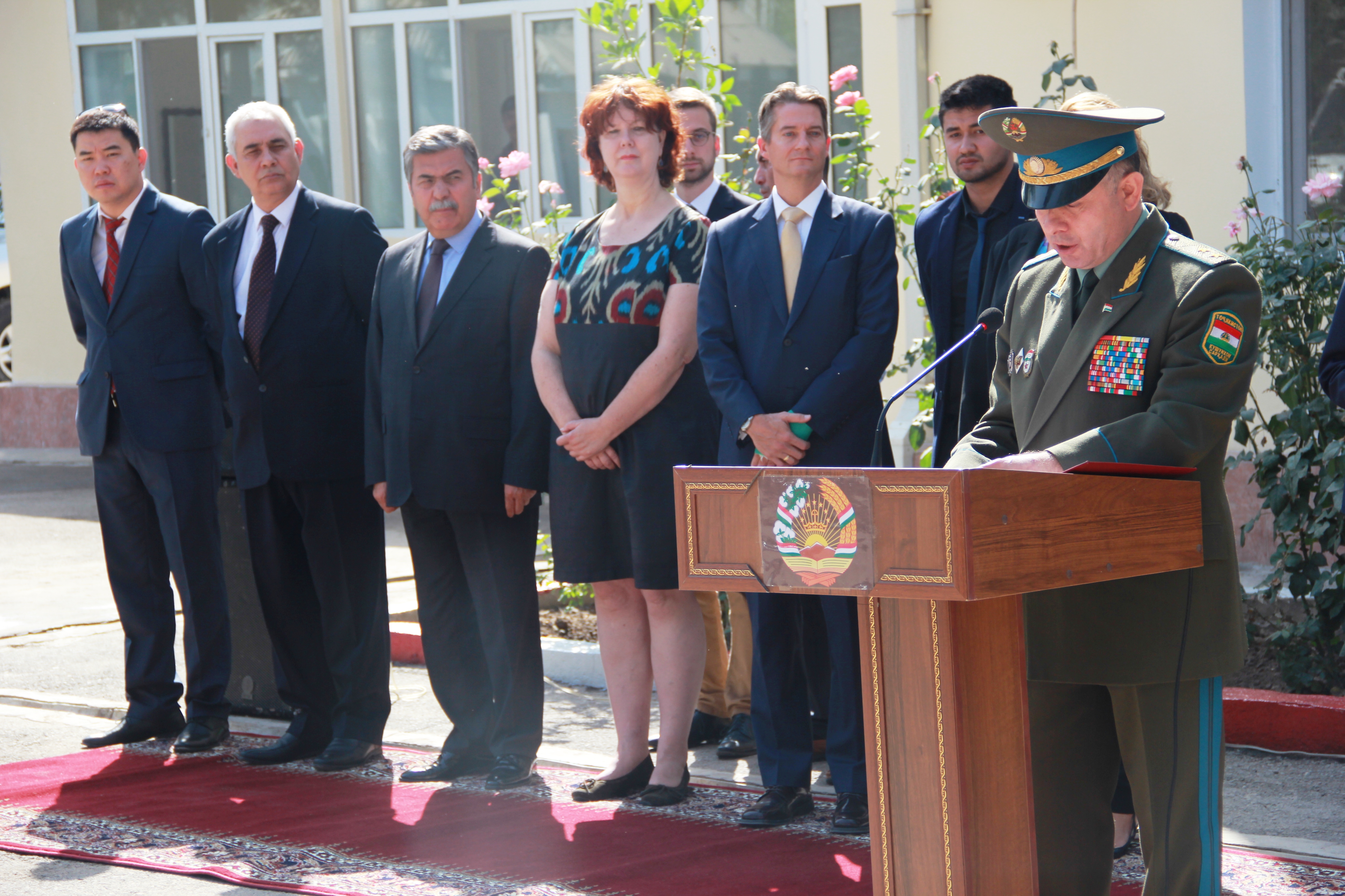 Head of the Tajik Border Troops of the State Committee for National Security, General Lieutenant Rajabali Rahmonali briefing the guests on current situation on the Tajik-Afghan border, Gissar Training Centre, 15 September 2017.