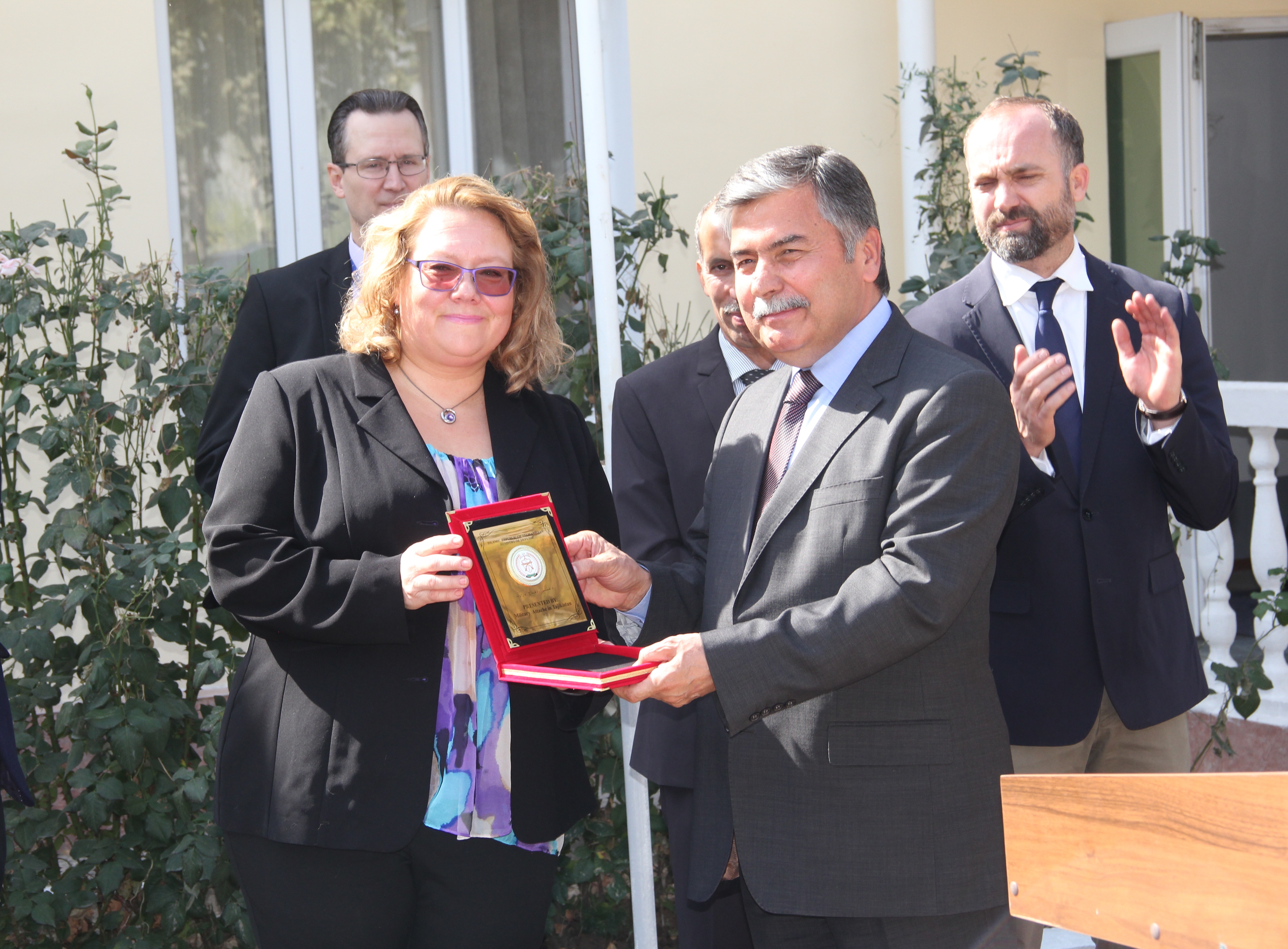 Afghan Attaché Said Osef Akram presenting a gift to Ambassador Tuula Yrjölä, Gissar Training Centre, 15 September 2017.