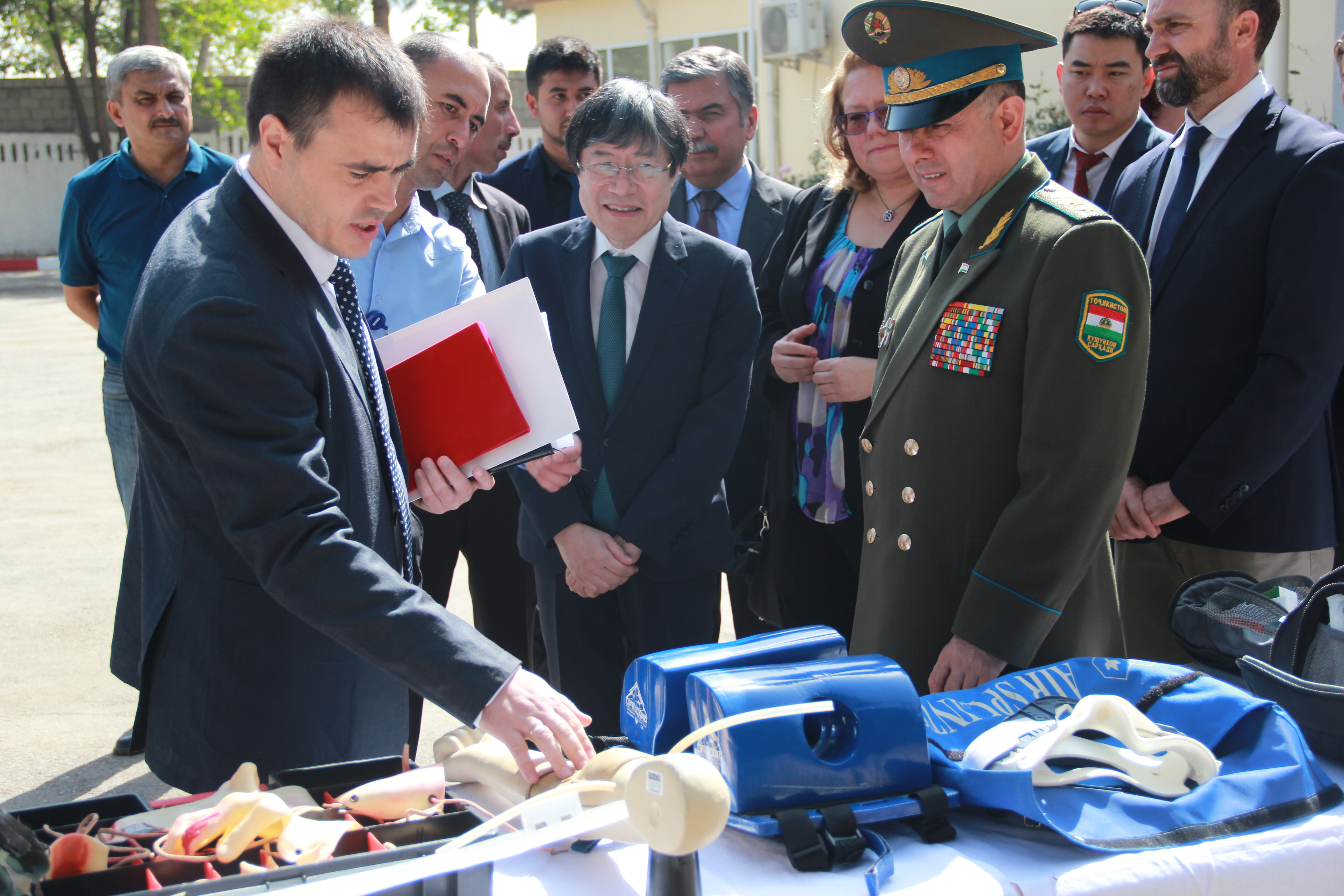 Vyacheslav Abramets, Border Management Adviser at the OSCE Office’s Politico-Military Department (l), presenting the displayed equipment used during a course under the Patrol Programming and Leadership Project, Gissar Training Centre, 15 September 2017.