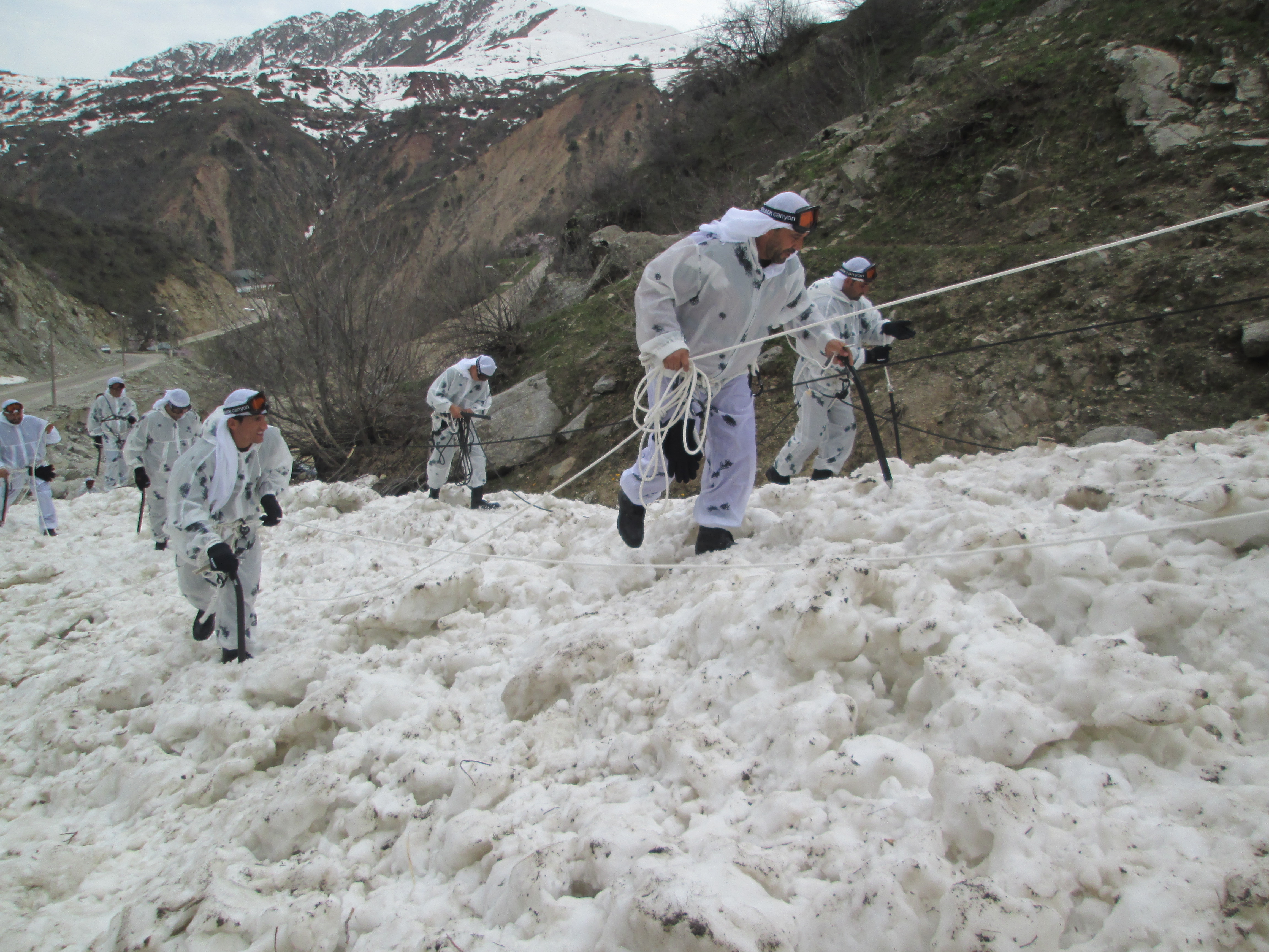 Afghan border troops using the technique of belay in a bundle. The technique ensures the safety of a search and rescue group while climbing or repelling of a mountain during rescue operations using the Bundle method, Khoja Obigarm, Tajikistan, 17 April 2017.