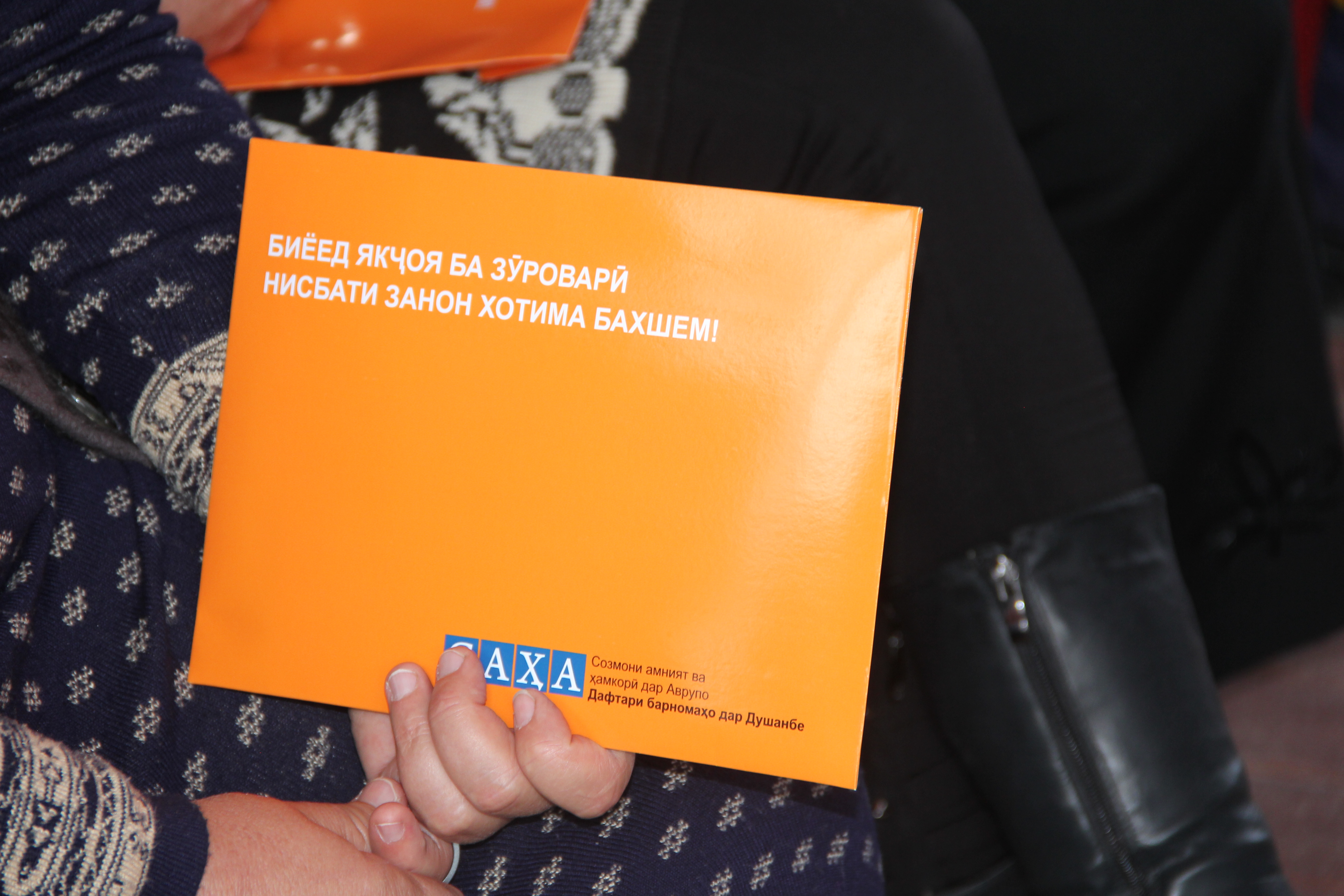 A participant holding an orange envelope with the title in Tajik ‘Together let’s end violence against women’. Khuroson District, Ayni Jamoat of Kurgan-Tyube, Tajikistan, 27 November 2017.
