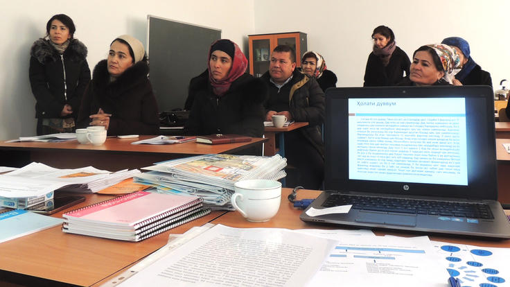 Participants of a one-day workshop for a newly-established multi-disciplinary working group on addressing domestic violence issues, Khuroson district, Tajikistan, 2 February 2018.