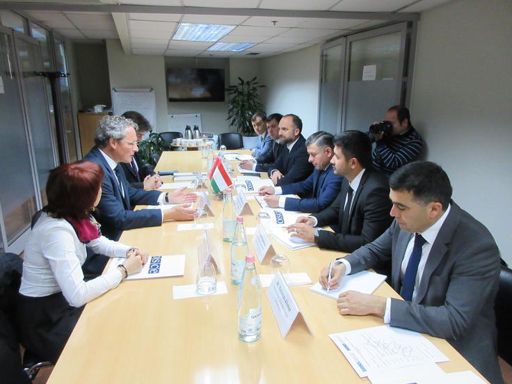 Bernd Borchardt (l), Head of the OSCE Presence in Albania, meets with Colonel-General Rajabali Rahmonali (centre-right), chairing a meeting of the Tajik Delegation, Tirana, 26 March 2018.