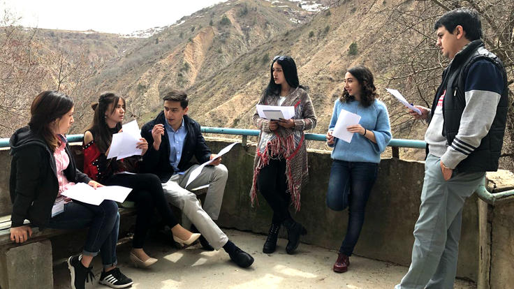 Participants trying to get the consensus-based resolution of the issue during the negotiation exercise in small working groups, Khoja Obigarm, 24 March 2018.