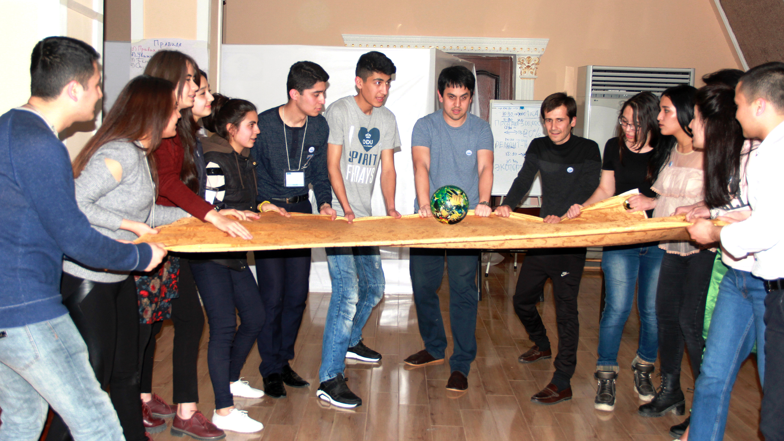 Participants develop teamwork skills during a teambuilding exercise. The teambuilding exercises are the integral part of the Model OSCE programme, Khoja Obigarm, 23 March 2018.