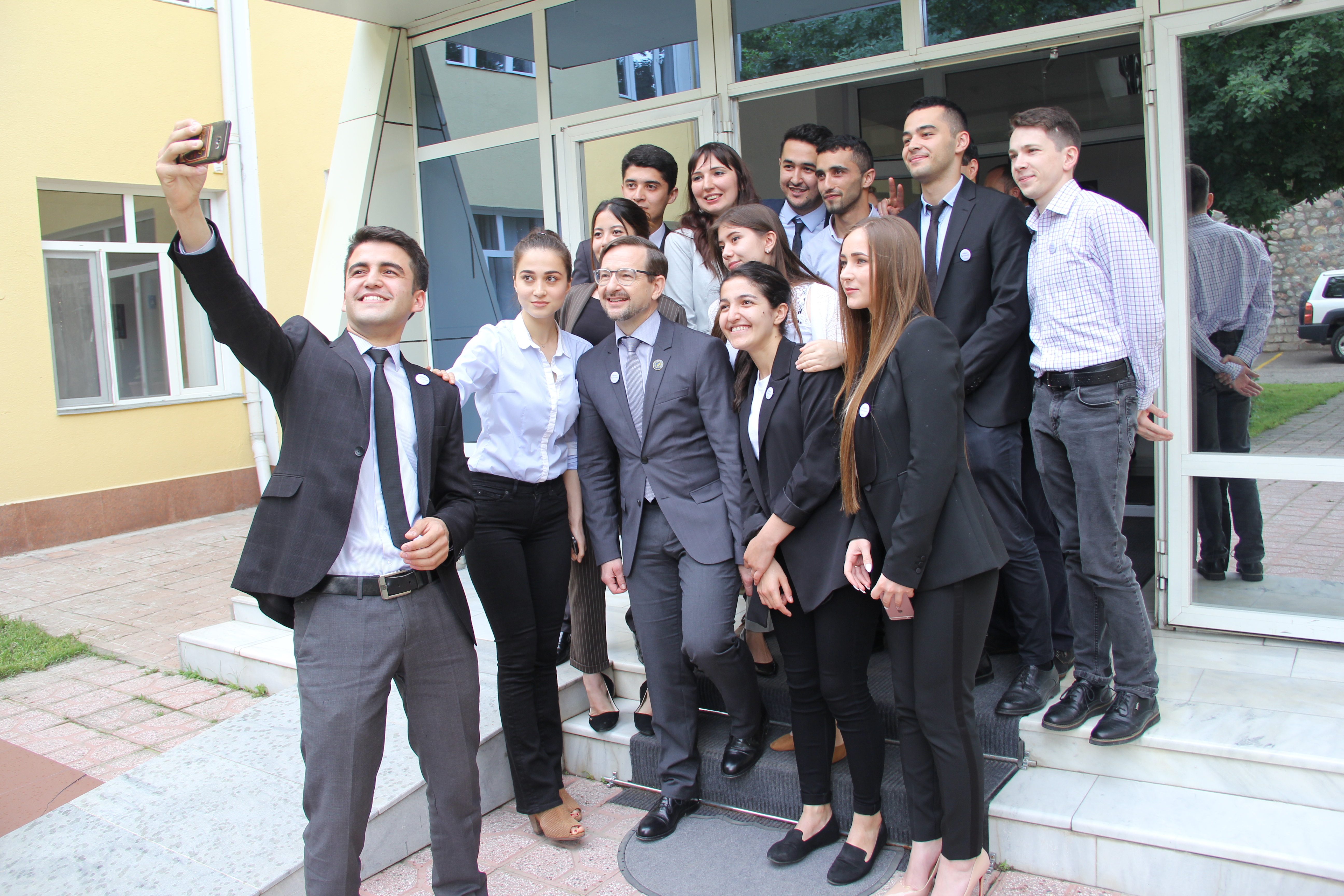 Youth representatives take a selfie with the OSCE Secretary General Thomas Greminger, Dushanbe, 3 May 2018.