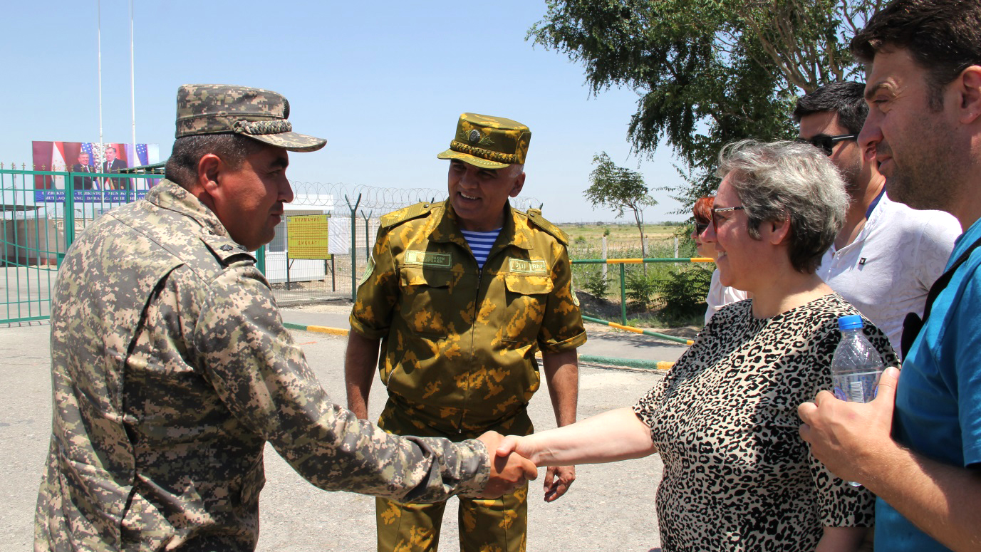 Representatives of the joint Albanian and Montenegrin delegation and the Tajik and Uzbek border troops at the Zafarobod border crossing point, Sughd region, Tajikistan, 28 June 2018.