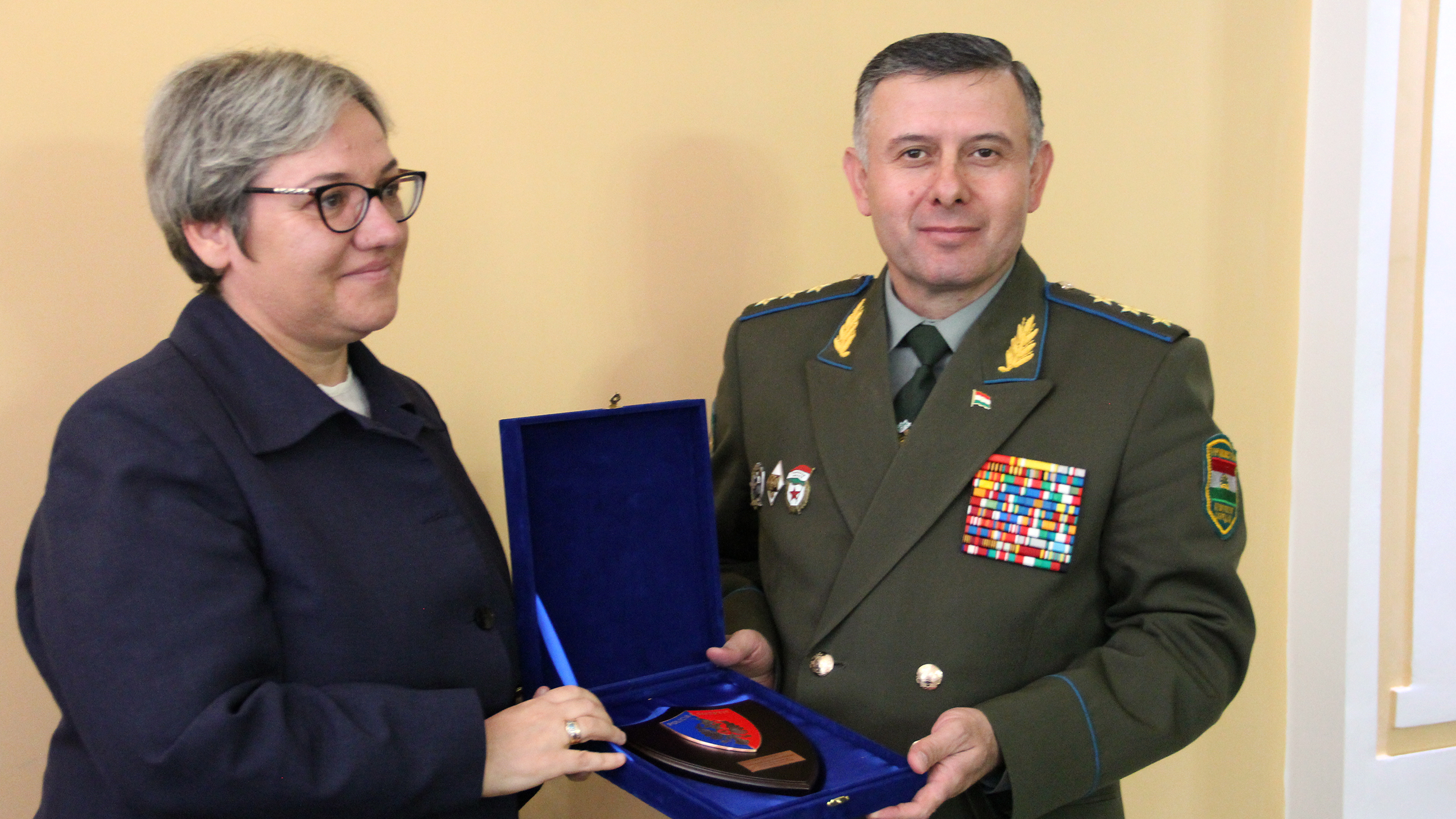 Aida Hajnaj (l), Deputy Director General of the Albanian State Police and Director General of the Albanian Border Police, presents an emblem of the Border Police to Colonel-General Rajabali Rahmonali (r), Commander of the Tajik Border Troops, Dushanbe, 26 June 2018.