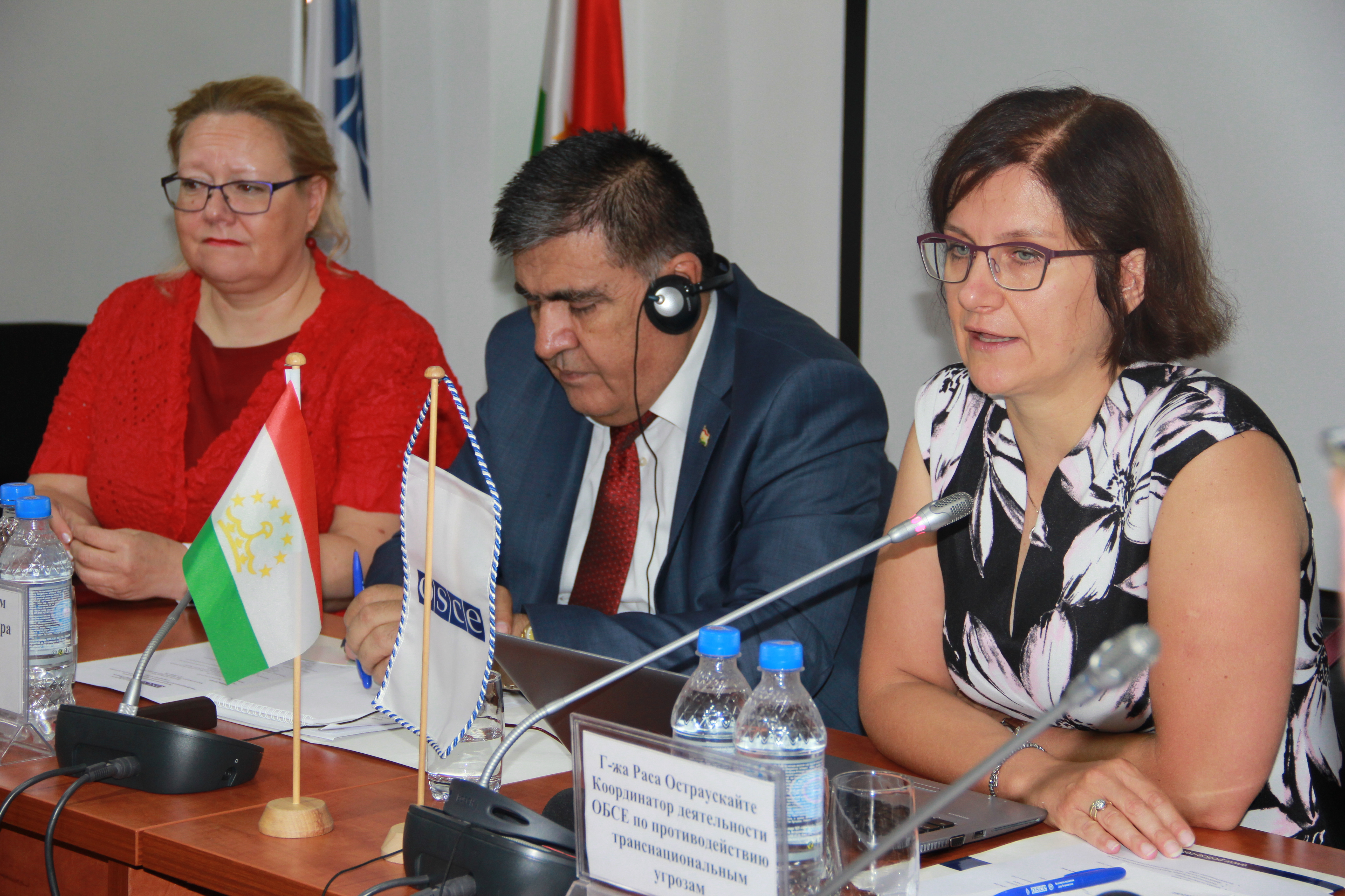 Left to right: Tuula Yrjölä, the Head of the OSCE Programme Office in Dushanbe, Umarzoda Ikrom, the Deputy Interior Minister of Tajikistan, and Rasa Ostrauskaite, the OSCE Co-ordinator of Activities to Address Transnational Threats, addressing the participants of the OSCE regional meeting of Heads of Law Enforcement Departments in Central Asia, Dushanbe, 24 July 2018.