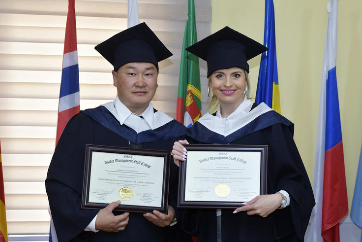 Magdalena Kulik (r) from Poland and Ganbaatar Jantsankhorloo from Mongolia during the graduation ceremony of the 3rd BMSC Postgraduate Diploma in Border Security and Management for Senior Leaders, Dushanbe, 20 September 2019.
