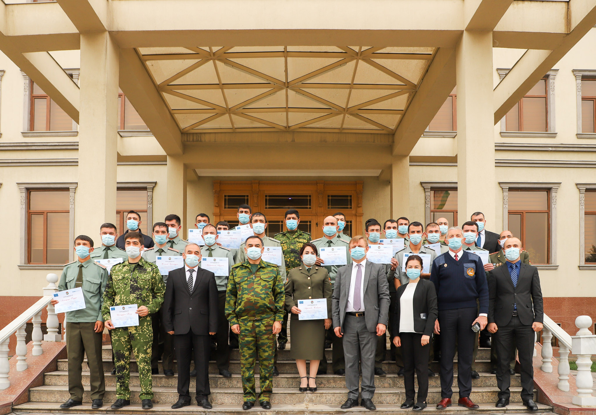 A group photo of officials from the OSCE and Tajikistan’s Committee of Emergency Situation and Civil Defence together with the graduates of the training course on emergency responses, Dushanbe, 10 October 2020