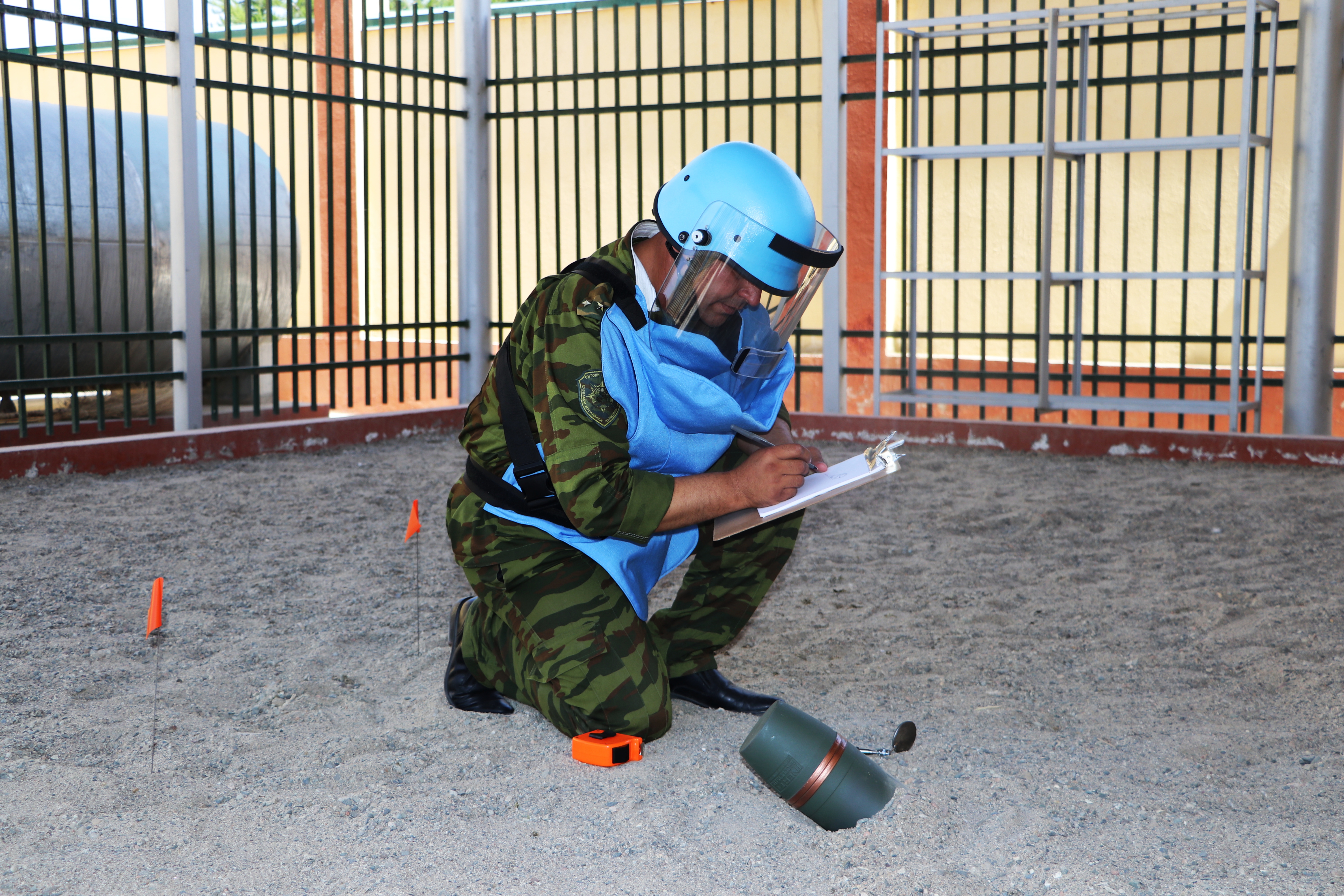 Participant of a one-month regional Explosive Ordnance Disposal course (level 2) during practical exercise on explosive ordnance reconnaissance, Chimteppa, Tajikistan, 3 June 2021.
