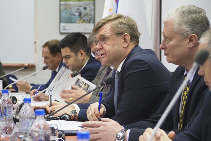 Valeriu Chiveri (r), Head of the OSCE Programme Office in Dushanbe, speaking at the roundtable event on "Afghanistan and Security Threats to the Central Asian Region" organized by the OSCE Border Management Staff College, Dushanbe, 19 November 2021.