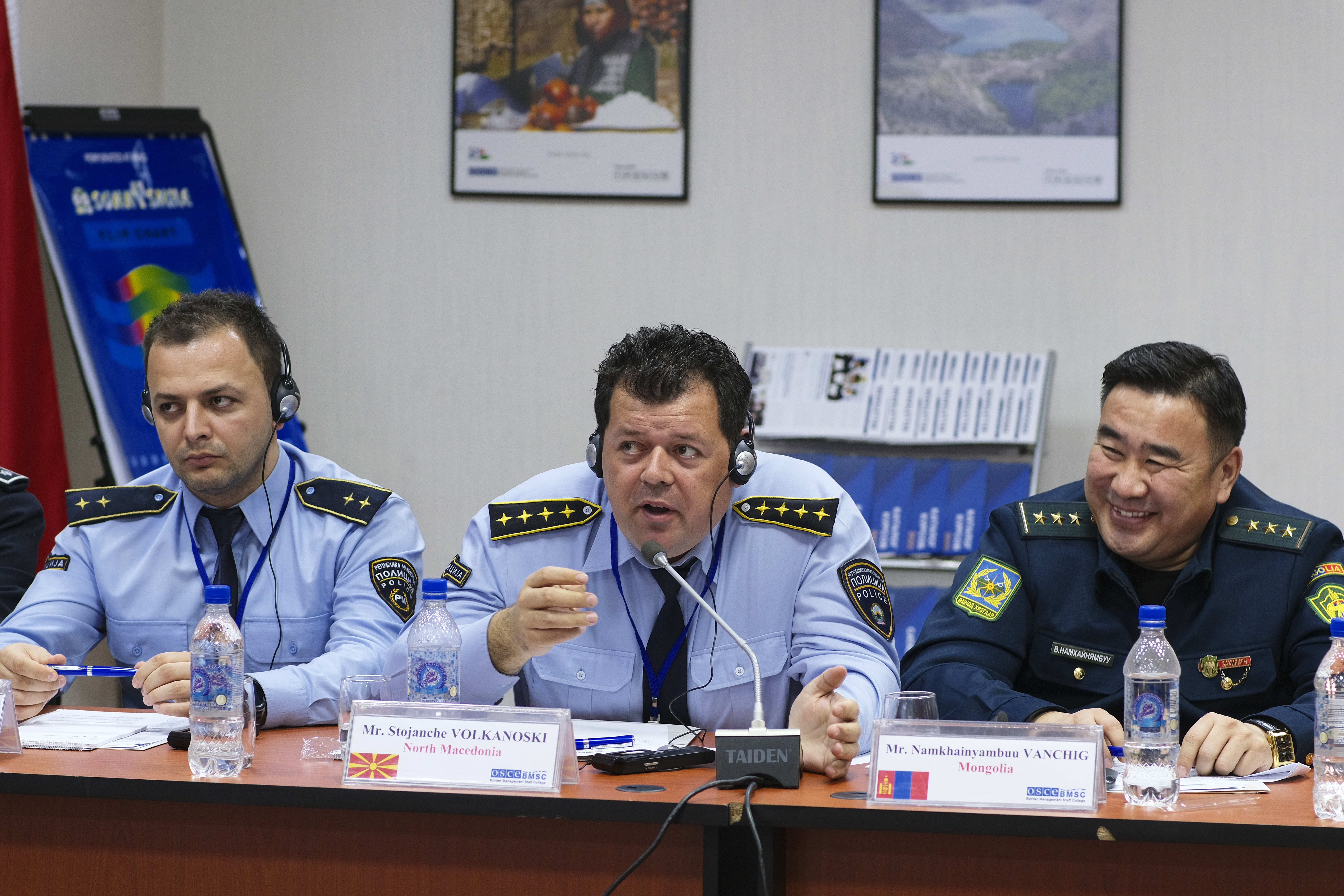 Participants of the OSCE BMSC 31st Staff Course Namkhainyambuu Vanchig from Mongolia, Stojanche Volkanoski and Darko Angelovski from North Macedonia during the Roundtable event on "Countering Heightened Cybersecurity Threats to Border Security and Management", Dushanbe, 11 March 2022.