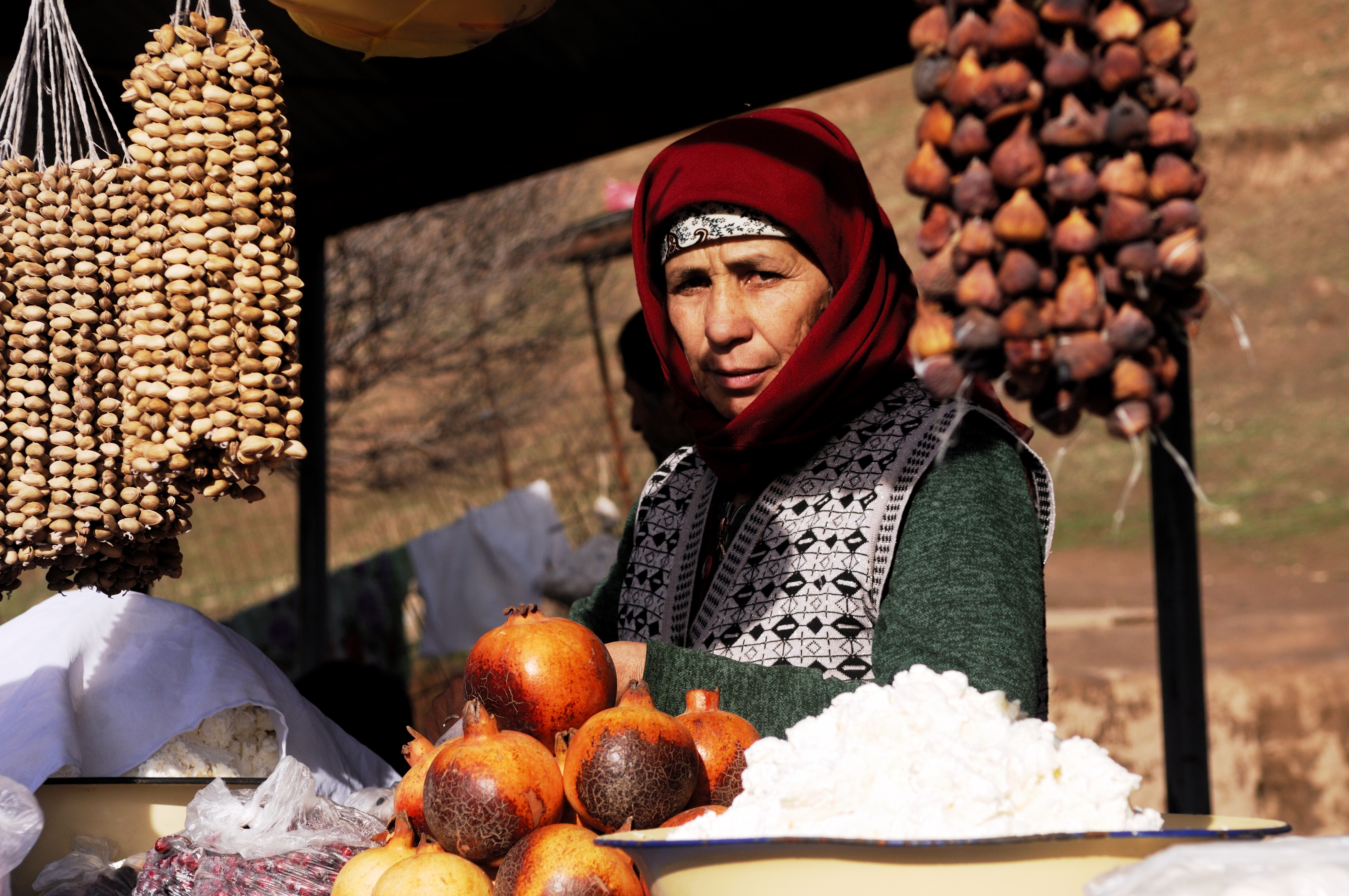 Tajik woman selling fruit and dried fruits in Khatlon region of Tajikistan, 29 November 2018.