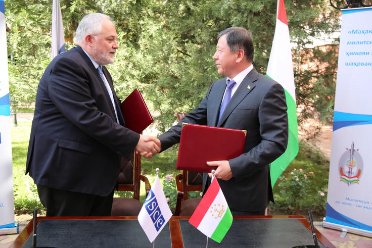 Acting Head of the OSCE Programme Office in Dushanbe Ambassador Vuk Zugic (left) and Interior Minister of Tajikistan Colonel General Rahimzoda Ramazon Hamro (right) during handover ceremony of minibuses, Dushanbe, 29 June 2022.