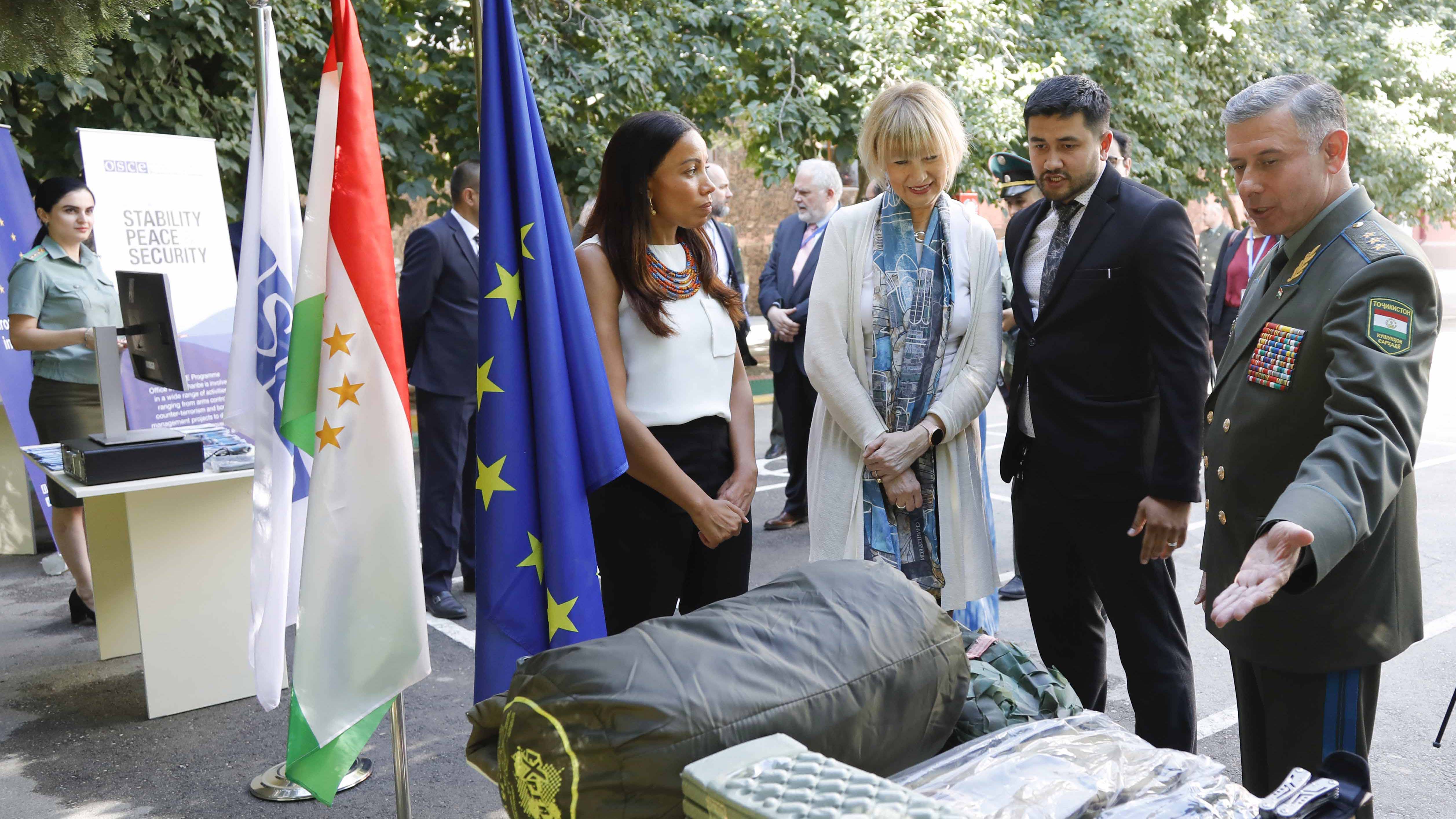 (left-right) Marilyn Josefson, Ambassador of the European Union to Tajikistan; Helga Maria Schmid, OSCE Secretary General; Daler Khamidov, National Border Management Officer at the OSCE Programme Office in Dushanbe and Colonel-General Rajabali Rahmonali, Commander of the Border Troops of Tajikistan at the handover ceremony of protective, technical and transport equipment for use along the border with Afghanistan, Dushanbe, 6 June 2022.