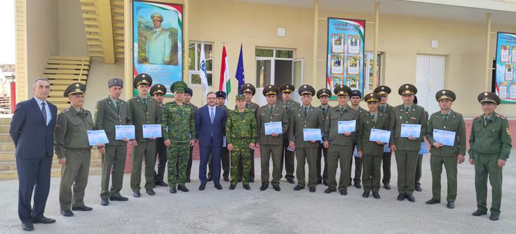 Ilgar Ibrahimli, Senior Executive Officer at the OSCE Programme Office in Dushanbe (centre-right), and Colonel Abdusalom Jalilzoda, Head of the Military Department of Tajikistan’s Committee of Emergency Situations and Civil Defence (centre-left) pose for a group photo with training participants of a two-week “Avalanche Safety” course, Dushanbe, 17 March 2023.