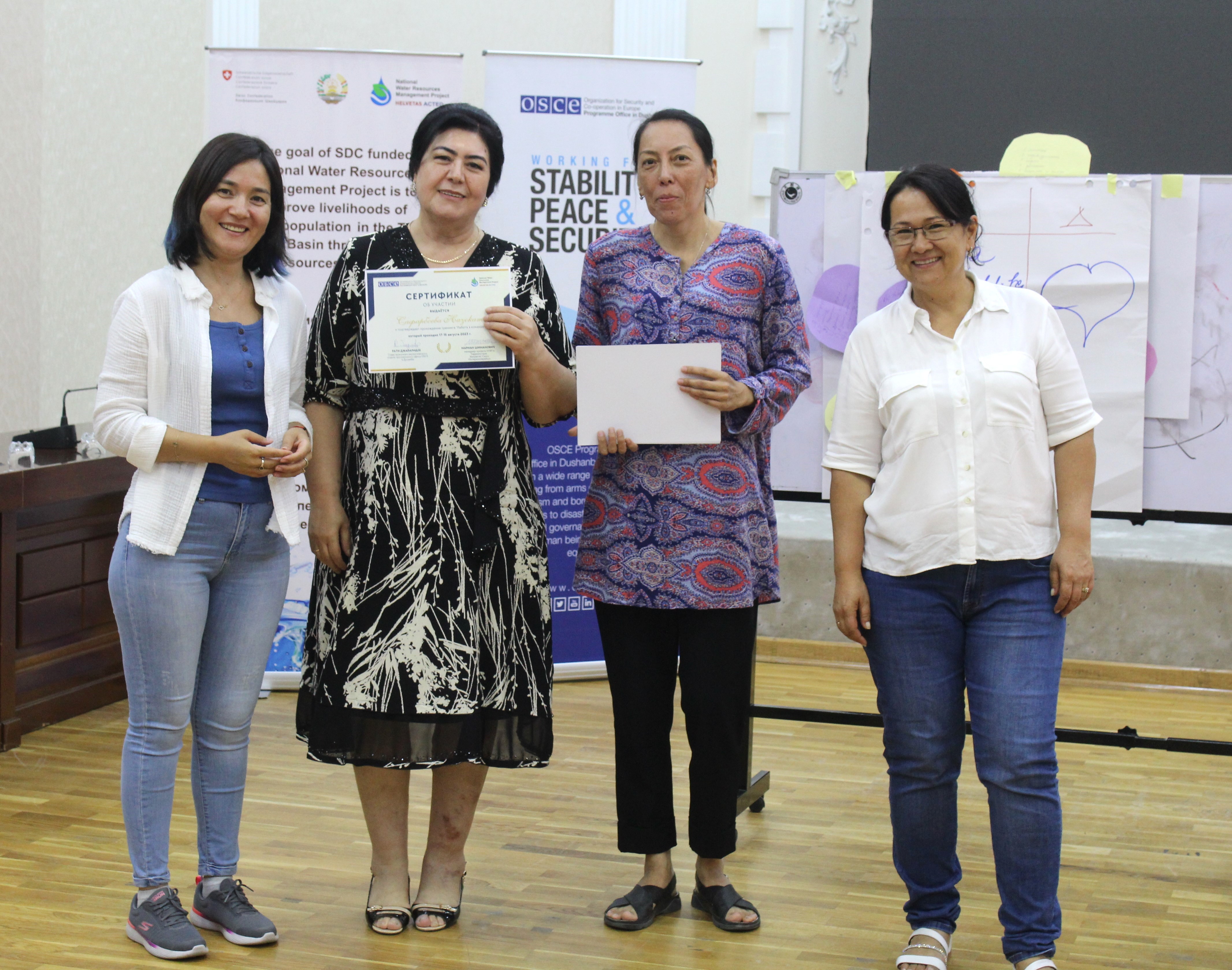 Participants and trainers of the Women Forum of Syrdarya River in Tajikistan pose for a group photo at the closing ceremony, Khujand, 27 August 2023.