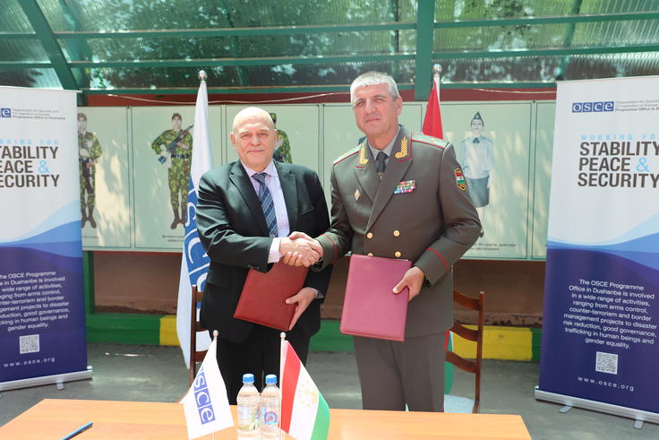 (left-right) Jukka Tuononen, the Officer-in-Charge of the OSCE Programme Office in Dushanbe and Major-General Rajabzoda Murodali Rajab, First Deputy Commander of Tajikistan’s Border Troops at the donation ceremony of technical and transport equipment for use along the border with Afghanistan, Dushanbe, 8 May 2024.