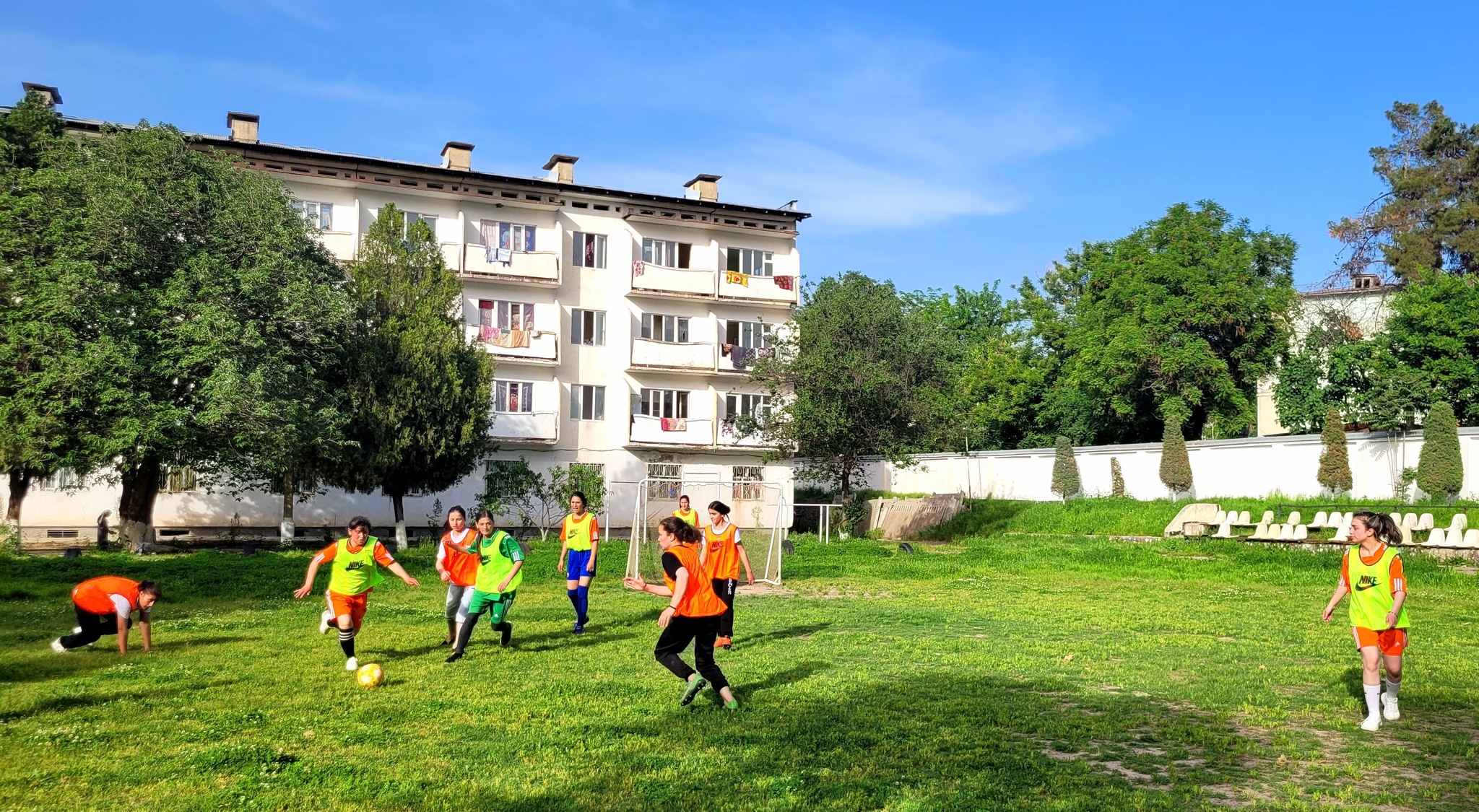 Young female participants taking part in a football tournament organized by the Ministry of Interior Public Councils and supported by the OSCE Programme Office in Dushanbe, Kulyab, Tajikistan, 14 April 2023.