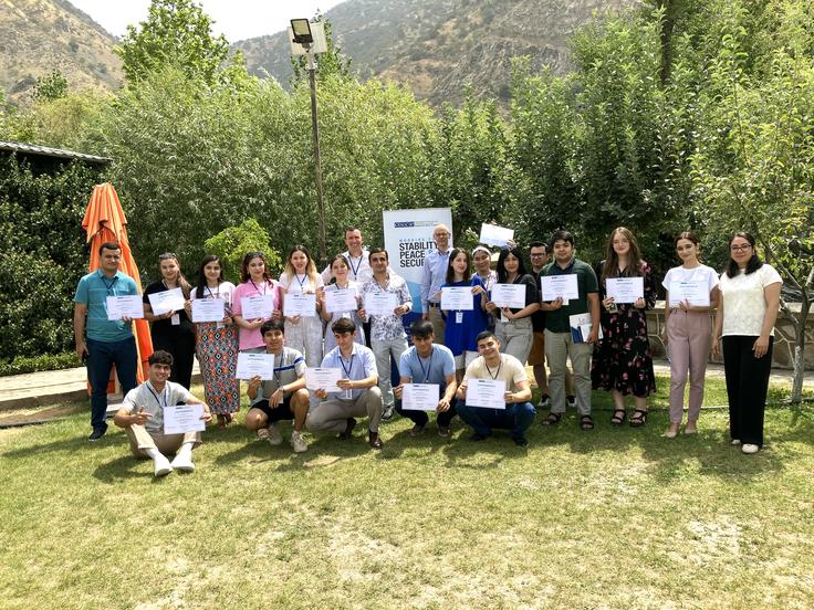 Participants of a one-week Anti-Corruption Summer School for Youth, along with OSCE representatives and experts, pose for a group photo with their completion certificates, Yos resort, Tajikistan, 16 August 2024.