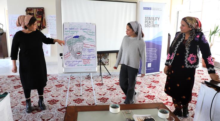 Facilitators from OSCE-supported Women’s Resource Centres leading a group presentation at the five-day train-the-trainers course in Dushanbe, 15 November 2023.