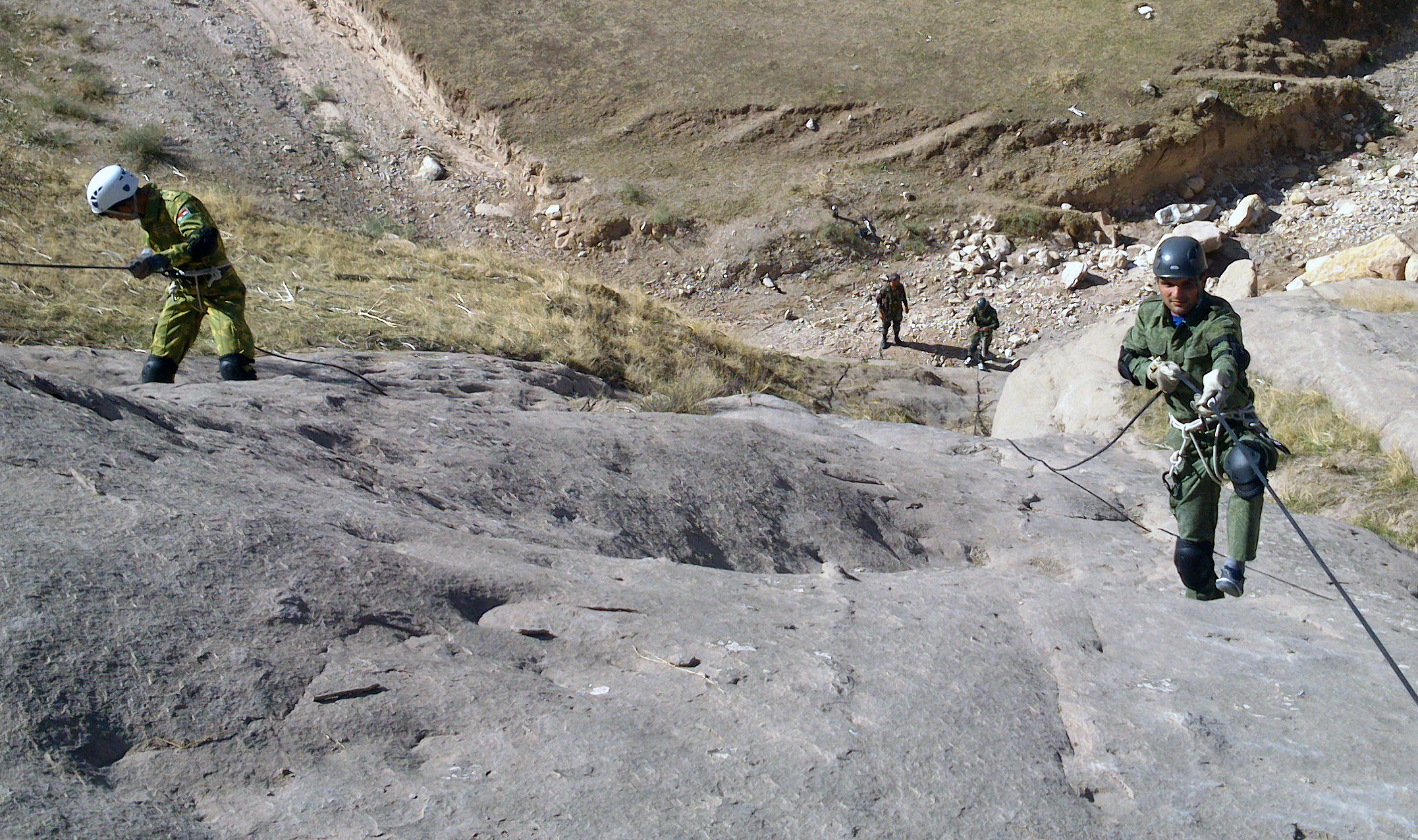 Таджикские пограничники на практических занятиях по альпинизму в рамках курса по патрулированию и руководству пограничным дозором-3, Гиссарский район, село Латтабанд, 29 октября 2015 г.