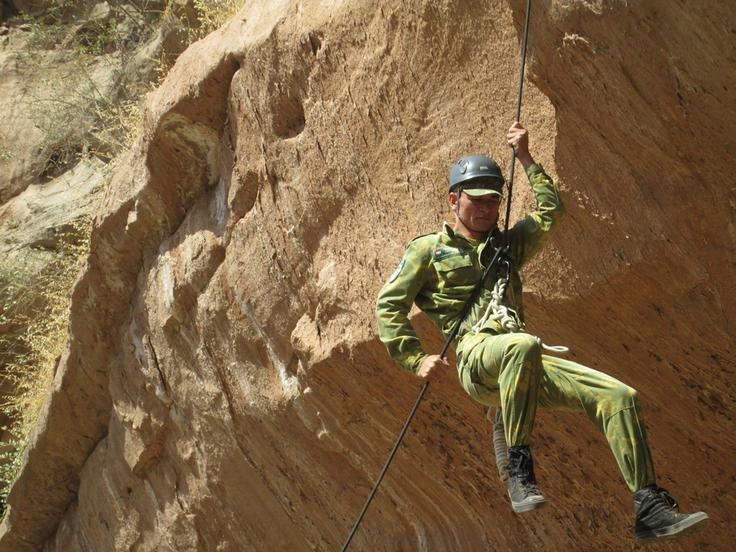 Офицер погранвойск Таджикистанa во время обучения приёмам скалолазания, Каратаг, Таджикистан, 30 августа 2016 г.