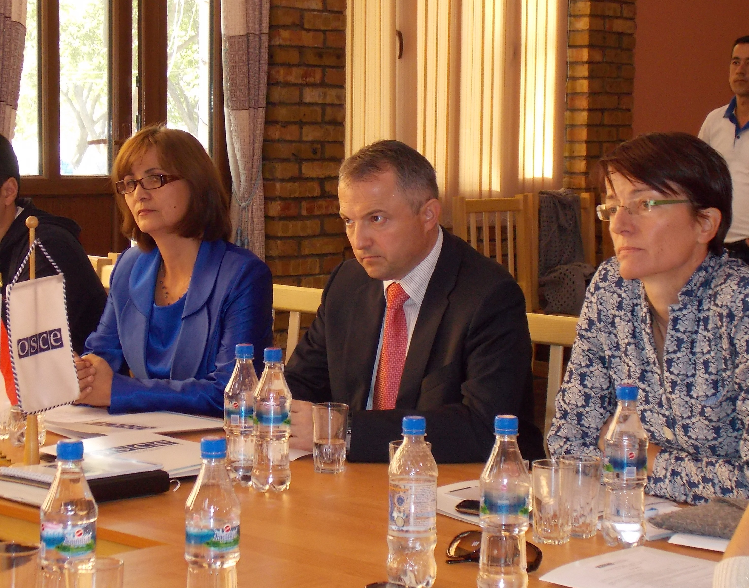 Слева направо: Модератор Сановбар Имомназарова; Полевой сотрудник ОБСЕ по Хатлонской Области Иван Эне; и Советник по вопросам прав человека Бюро ОБСЕ в Таджикистане Фредерике Бер в ходе совместного совещания по вопросам безгражданства, г. Шаартуз.
