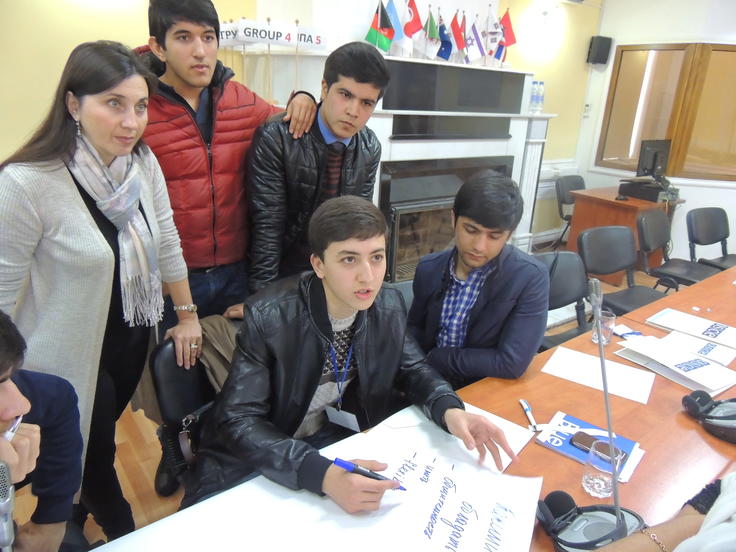 Весна Иванович-Кастаред, руководитель отдела по вопросам демократизации Бюро ОБСЕ в Таджикистане (слева) с группой участников тренинга для молодёжи на тему борьбы с гендерными стереотипами, Душанбе, 1 декабря 2016 года.