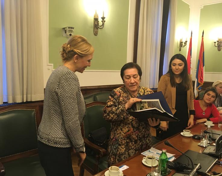 Гульджахон Бобосадыкова, национальный эксперт по гендерным вопросам (в центре) передаёт в дар книгу по истории Таджикистана Стефане Миладинович, члену парламента Сербии (слева), Белград, 13 декабря 2016 года.