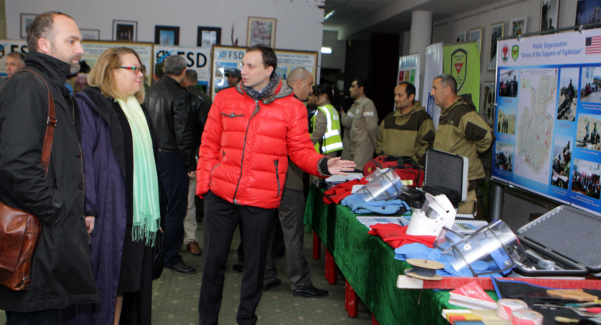 Фейзо Нуманай, Глава Военно-политического департамента Бюро ОБСЕ в Таджикистане, Посол Туула Юрьёля, Глава Бюро ОБСЕ в Таджикистане и Лука Бухин, сотрудник по программам вышеназванного департамента (слева-направо) на выставке, посвящённой Международному дню просвещения по вопросам минной опасности и помощи в деятельности, связанной с разминированием, Душанбе, 4 апреля 2017 г.