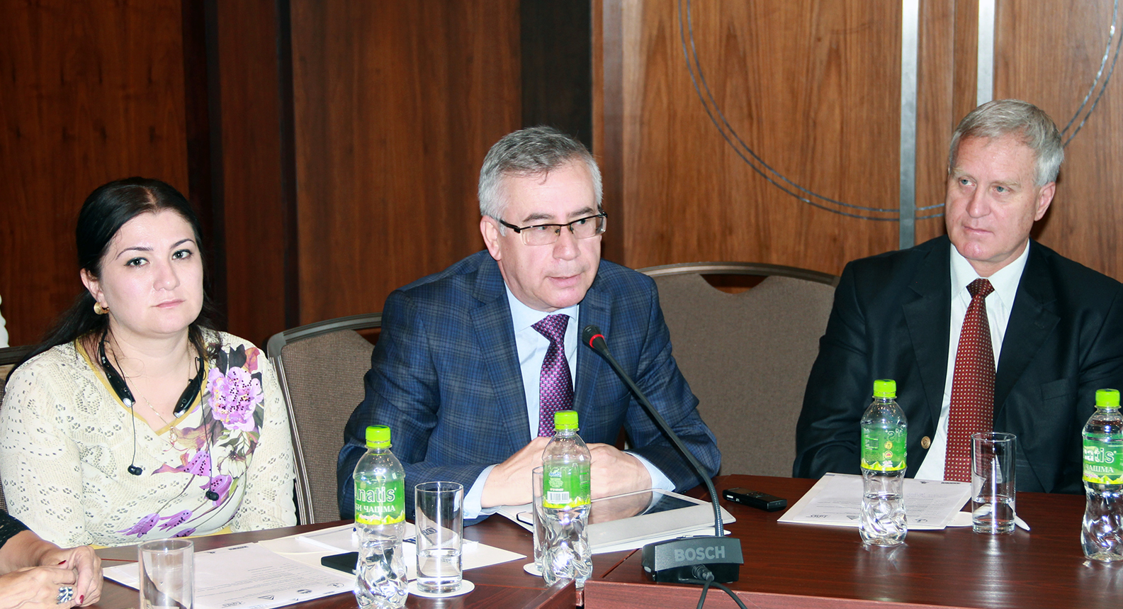 Председатель Национальной ассоциации независимых средств массовой информации Таджикистана Нуриддин Каршибоев (в центре) и Глава Департамента по человеческому измерению Бюро ОБСЕ в Таджикистане Скотт Кирин (справа), выступают с речью на конференции, посвященной Всемирному дню свободы печати, Душанбе, 3 мая 2017 года.