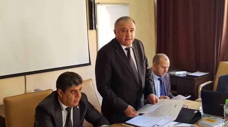 На фото (слева-направо) Завкизода Солех, директор Центра Верховного суда по вопросам образования судей; Кодирзода Тохир, глава Коллегии по гражданским делам и Фаррухшо Джунайдов, исполняющий обязанности сотрудника по связам со СМИ Офиса программ ОБСЕ в Душанбе, на семинаре для судей и журналистов в Таджикистане, Ходжа Оби Гарм, 21 сентября 2017 г.