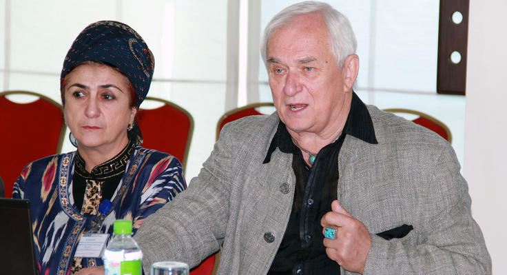 Саулюс Смалис, международный консультант по вопросам «зелёной» экономики (справа) во время выступления на учебном семинаре по вопросам продвижения принципов «зелёной» экономики и Савринисо Хафизова, руководитель Орхусского центра в Гарме (слева), Душанбе, 9 октября 2017 г.