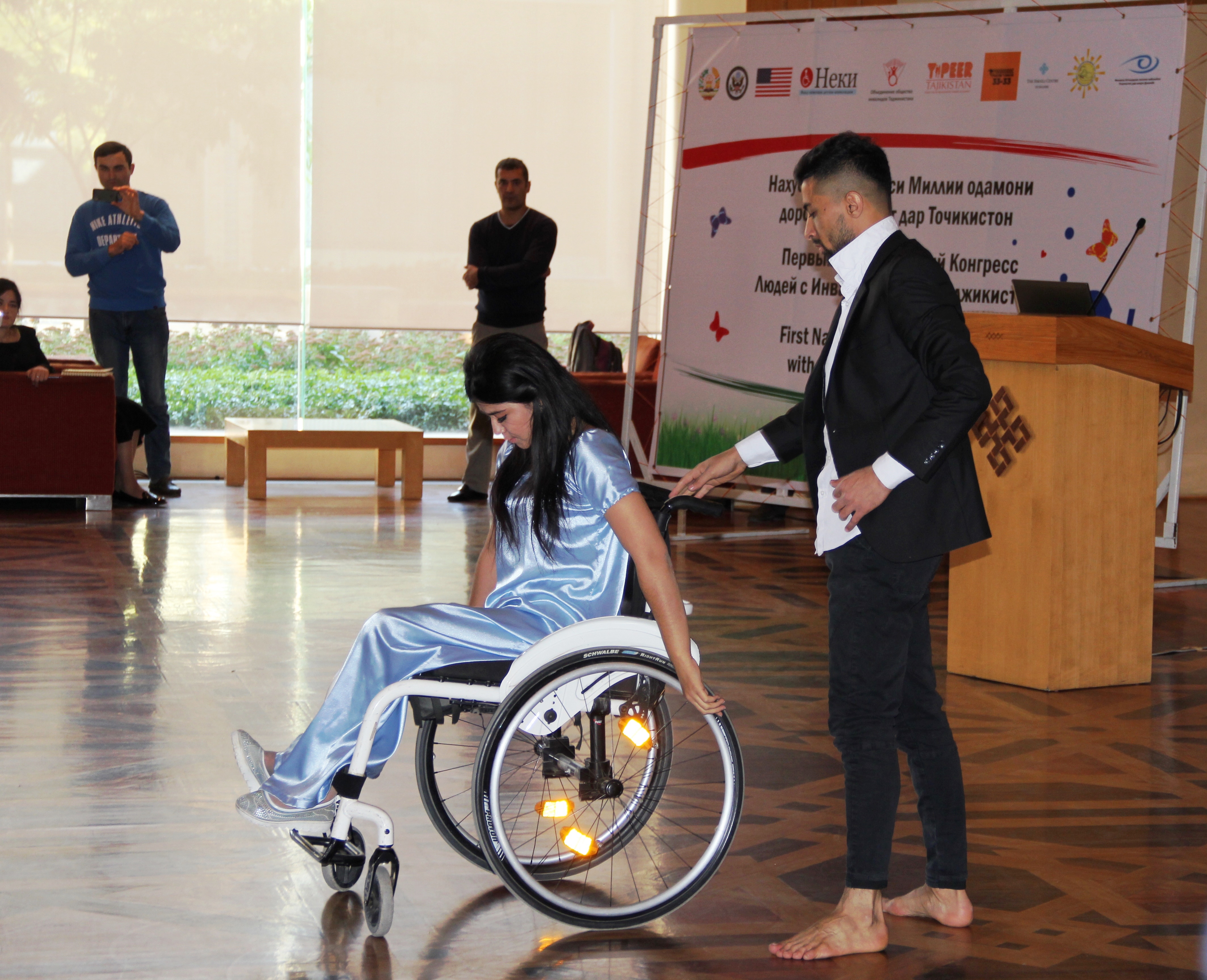 Участница первого Национального конгресса людей с ограниченными возможностями исполняет танец на инвалидной коляске со своим партнером по танцу, Душанбе, Таджикистан.