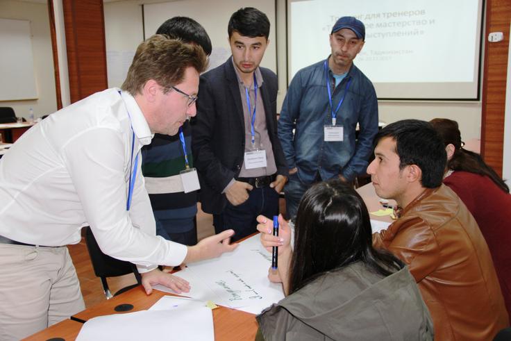 Павел Чашук, тренер в области прав человека из Беларуси (слева) во время проведения практического занятия с участниками, Душанбе, 7 ноября 2017 г. (ОБСЕ/Мунира Шоинбекова)