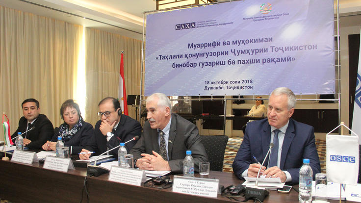 Справа налево: Скотт Кеарин, глава Департамента по вопросам человеческого измерения Офиса программ ОБСЕ в Душанбе, Олим Салимзода, глава комитета по международным делам, общественным связям и информации нижней палаты парламента Таджикистана, Ильгар Ибрагимли, сотрудник по вопросам работы со СМИ Офиса программ ОБСЕ в Душанбе, Наталя Довнар, медиа-эксперт из Беларусии и Ранжет Ятимов, медиа-эксперт из Таджикистана, Душанбе, 18 октября 2018 г.