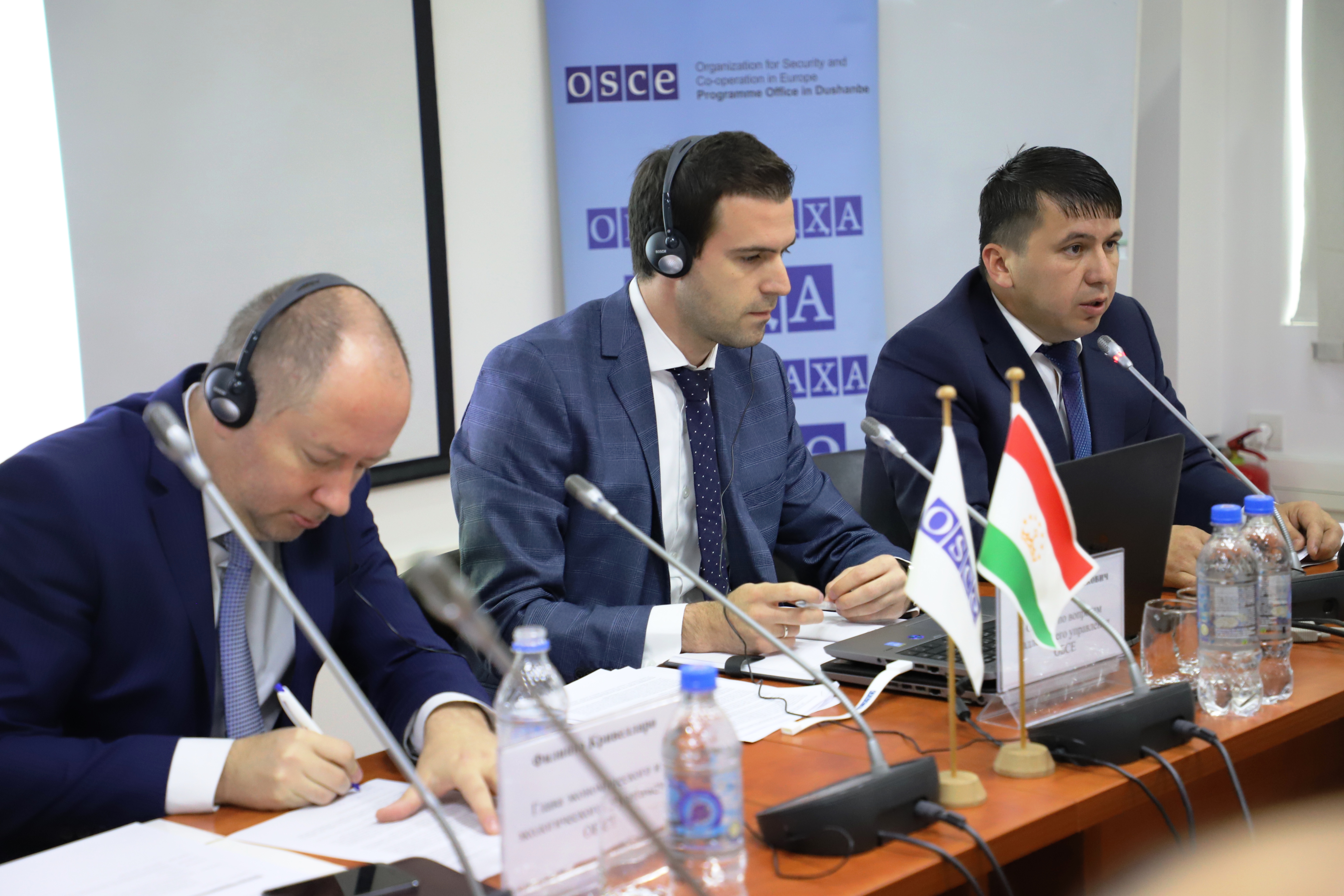 Слева направо: Филиппо Кривелларо, глава Департамента по экономическим и экологическим вопросам Программного офиса ОБСЕ в Душанбе; Александар Машкович, советник по вопросам эффективного управления Программного офиса ОБСЕ в Душанбе, и Алихон Розикзода, руководитель Международного отдела, по связям с общественностью и средствами массовой информации Главного управления по предупреждению коррупции Агентства государственного финансового контроля и борьбы с коррупцией Республики Таджикистан, Душанбе, 12 марта 2020.