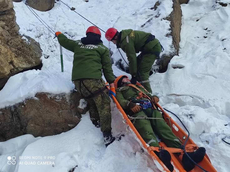 Спасатели из Комитета по чрезвычайным ситуациям и гражданской обороне Таджикистана во время практических занятий в Варзобском районе, 25 января 2021 года.